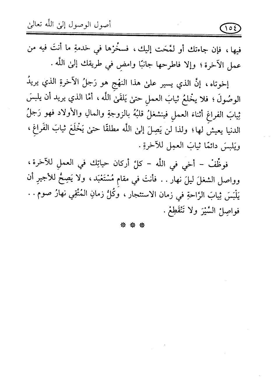 إخوتاه , إن الذى يسير على هذا النهج هو رجل الآخرة الذى يريد الوصول , فلا يخلع ثياب العمل حتى يلقى الله , أما الذى يريد أن يلبس ثياب الفراغ أثناء العمل فينشغل قلبه بالزوجة والمال والاولاد فهو رجل الدنيا يعيش لها , ولذا لن يصل إلى الله مطلقا حتى يخلع ثياب الفراغ , ويلبس دائما ثياب العمل لآخرة.