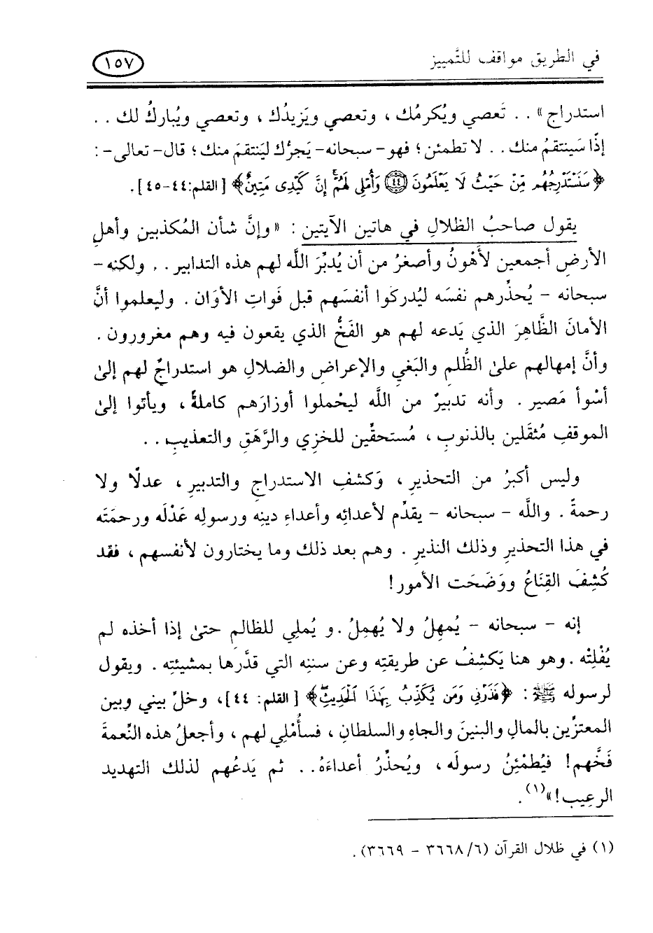 إنه - سبحانه - يمهل ولا يهمل , ويملى للظالم حتى إذا أخذه لم يفلته , وهو هنا يكشف عن طريقته وعن سننه التى قدرها بمشيئته , ويقول لرسوله صلى الله عليه وسلم " فذرنى ومن يكذب بهذا الحديث " (القلم: 44) , وخل بينى وبين المعتزين بالمال والبنين والجاه والسلطان , فسأملى لهم , وأجعل هذه النعمة فخهم! فيطمئن رسوله , ويحذر اعداءه .. ثم يدعهم لذلك التهديد الرعيب ".
