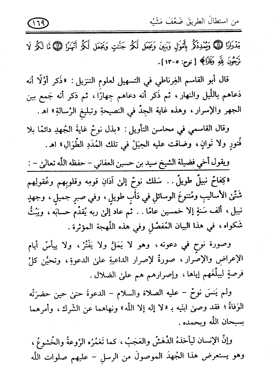 " كفاح نبيل طويل: سلك نوح إلى آذان قومه وقلوبهم وعقولهم شتى الاساليب ومتنوع الوسائل فى دأب طويل , وفى صبر جميل , وجهد نبيل , ألف سنة إلا خمسين عاما .. ثم عاد إلى ربه ليقدم حسابه , ويبث شكواه , فى هذا البيان المفصل وفى هذه اللهجة المؤثرة.