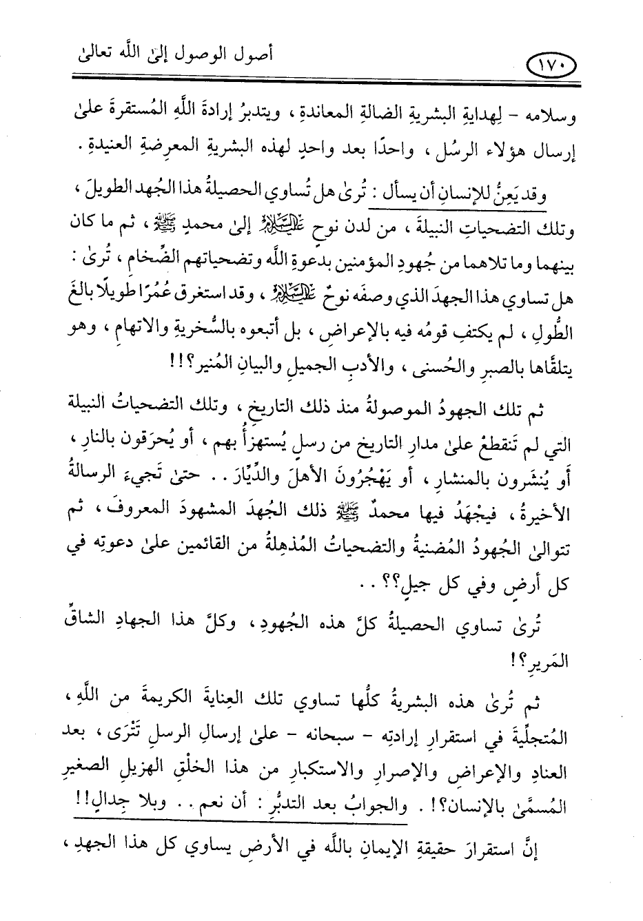 وقد يعن للانسان ان يسأل: ترى هل تساوى الحصيلة هذا الجهد الطويل , وتلك التضحيات النبيلة , من لدن نوح عليه السلام إلى محمد صلى الله عليه وسلم , ثم ما كان بينهما وما تلاهما من جهود المؤمنين بدعوة الله وتضحياتهم الضخام , ترى: هل تساوى هذا الجده الذى وصفه نوح عليه السلام , وقد استغرق عمرا طويلا بالغ الطول , لم يكتف قومه فيه بالاعراض , بل اتبعوه بالسخرية والاتهام , وهو يتلقاها بالصبر والحسنى , والادب الجميل والبيان المنير؟!!.