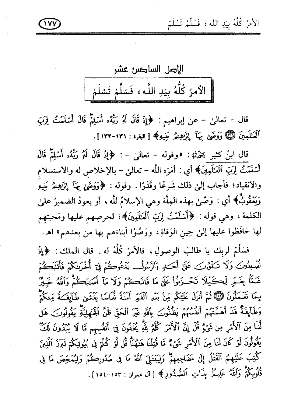 فسلم لربك يا طالب الوصول , فالأمر كله له , قال الملك: " إذ تعدون ولا تلون على أحد والرسول يدعوكم فى أخراكم فأثابكم غمّا بغمّ لكيلا تحزنوا على ما فاتكم ولا ما أصابكم والله خبير بما تعملون * ثم أنزل عليكم من بعد الغم أمنة نعاسا يغشى طائفة منكم وطائفة قد أهمتهم أنفسهم يظنون بالله غير الحق ظن الجاهلية يقولون هل لنا من الأمر من شىء قل إن الامر كله لله يخفون فى أنفسهم ما لا يبدون لك يقولون لو كان لنا من الامر شىء ما قتلنا ها هنا قل لو كنتم فى بيوتكم لبرز الذين كتب عليهم القتل إلى مضاجعهم ولبتلى الله ما فى صدوركم وليمحص ما فى قلوبكم والله عليم بذات الصدور " (آل عمران: 153 - 154).