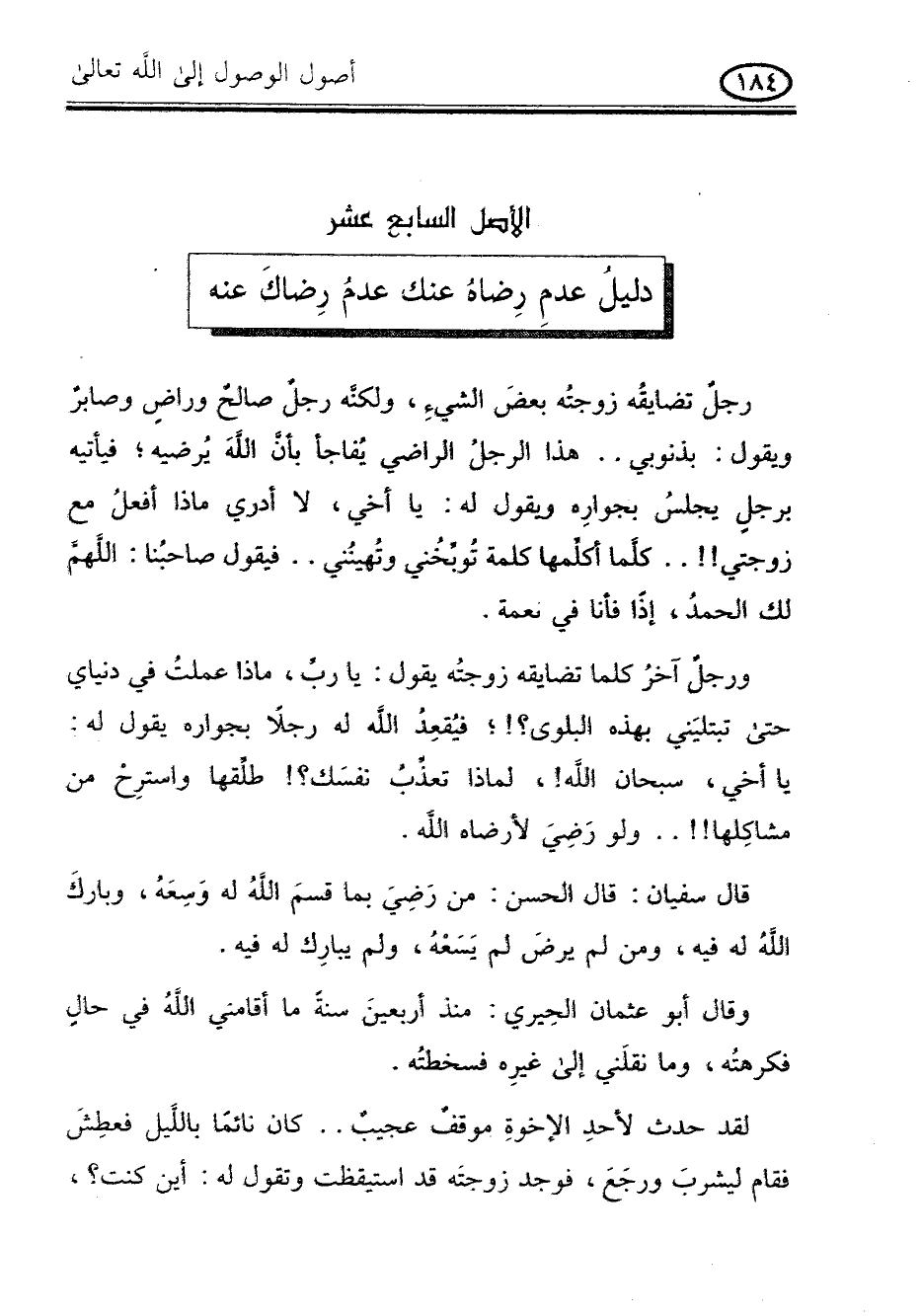 رجل تضايقه زوجته بعض الشىء , ولكنه رجل صالح وراض وصابر ويقول: بذنوبى .. هذا الرجل الراضى يفاجأ بأن الله يرضيه , فيأتيه برجل يجلس بجواره ويقول له: يا أخى , لا أدرى ماذا أفعل مع زوجتى!! .. كلما أكلمها كلمة توبخنى وتهيننى .. فيقول صاحبنا: اللهم لك الحمد , إذا فأنا فى نعمة.