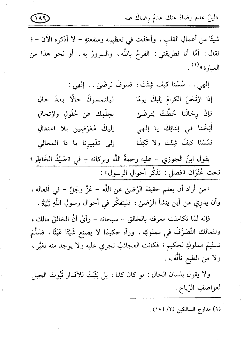 فإنه لمّا تكاملت معرفته بالخالق - سبحانه - رأى أن الخالق مالك , وللمالك التصرف فى مملوكه , ورأه حكيما لا يصنع شيئا عبثا , فسلم تسليم مملوك لحكيم , فكانت العجائب تجرى عليه ولا يوجد منه تغير , ولا من الطبع تأفف.