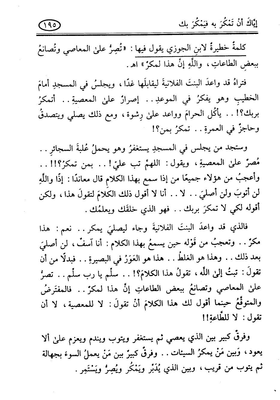 فتراه قد واعد البنت الفلانية ليقابلها غدا , ويجلس فى المسجد أمام الخطيب وهو يفكر فى الموعد .. إصرار على المعصية .. أتمكر بربك؟! .. يأكل الحرام وواعد على رشوة , ومع ذلك يصلى ويتصدق وحاجز فى العمرة .. تمكر بمن؟!. وستجد من يجلس فى المسجد يستغفر وهو يحمل علبة السجائر .. مصر على المعصية , ويقول: اللهم تب علىّ! .. بمن تمكر؟!! .. وأعجب من هؤلاء جميعا من إذا سمع بهذا الكلام قال معاندا: إذا والله لن أتوب ولن أصلى .. لا .. أنا لا أقول ذلك الكلام لتقول هذا , ولكن أقوله لكى لا تمكر بربك .. فهو الذى خلقك ويعلمك.
