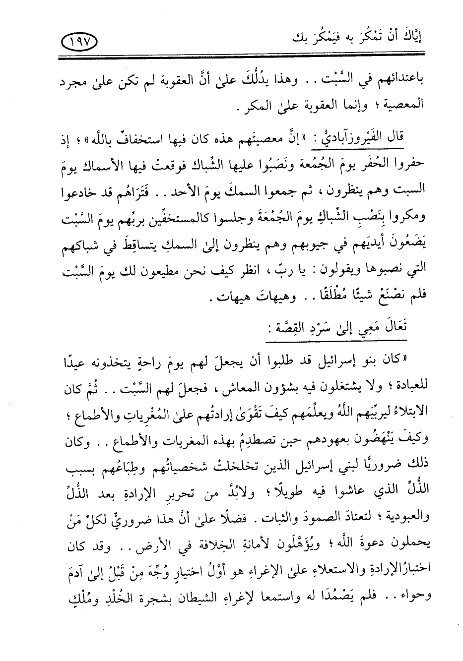 " كان بنو إسرائيل قد طلبوا أن يجعل لهم يوم راحة يتخذونه عيدا للعبادة , ولا يشتغلون فيه بشؤون المعاش , فجعل لهم السبت .. ثم كان الابتلاء ليربيهم الله ويعلمهم كيف تقوى إرادتهم على المغريات والأطماع , وكيف ينهضون بعهودهم حين تصطدم بهذه المغريات والأطماع .. وكان ذلك ضروريا لبنى إسرائيل الذين تخلخلت شخصياتهم وطباعهم بسبب الذل الذى عاشوا فيه طويلا , ولابد من تحرير الإرادة بعد الذل والعبودية , لتعتاد الصمود والثبات. فضلا على أن هذا ضرورى لكل من يحملون دعوة الله , ويؤهلون لأمانة الخلافة فى الأرض .. وقد كان اختبار الإرادة والاستعلاء على الإغراء هو أول اختيار وجه من قبل إلى آدم وحواء .. فلم يصمدا له واستمعا لإغراء الشيطان بشجرة الخلد وملك