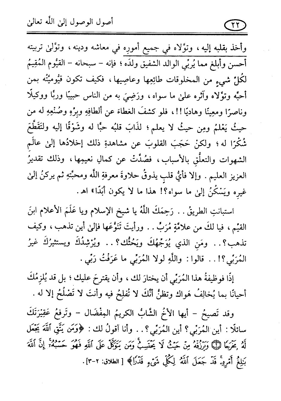 واخذ بقلبه إليه وتولاه في جميع أموره في معاشه ودينه وتولى تربيته أحسن وأبلغ مما يربى الوالد الشفيق ولده فانه - سبحانه- القيوم المقيم لكل شىء من المخلوقات طائعها وعاصيها فكيف تكون قيوميته بمن أحبه وتولاه وآثره على ما سواه ورضى به من الناس حبيبا وربا ووكيلا وناصرا ومعينا وهاديا!! فلو كشف الغطاء عن ألطافه وبره وصنعه له من حيث يعلم ومن حيث لا يعلم لذاب قلبه حبا له وشوقا إليه ولتقطع شكرا له، ولكن حجب القلوب عن مشاهدة ذلك اخلادها إلى عالم الشهوات والتعلق بالاسباب فصدت عن كمال نعيمها وذلك تقدير العزيز العليم. والا فأى قلب يذوق حلاوة معرفة الله ومحبته ثم يركن إلى غيره ويسكن إلى ما سواه؟! هذا ما لا يكون أبدا ".
