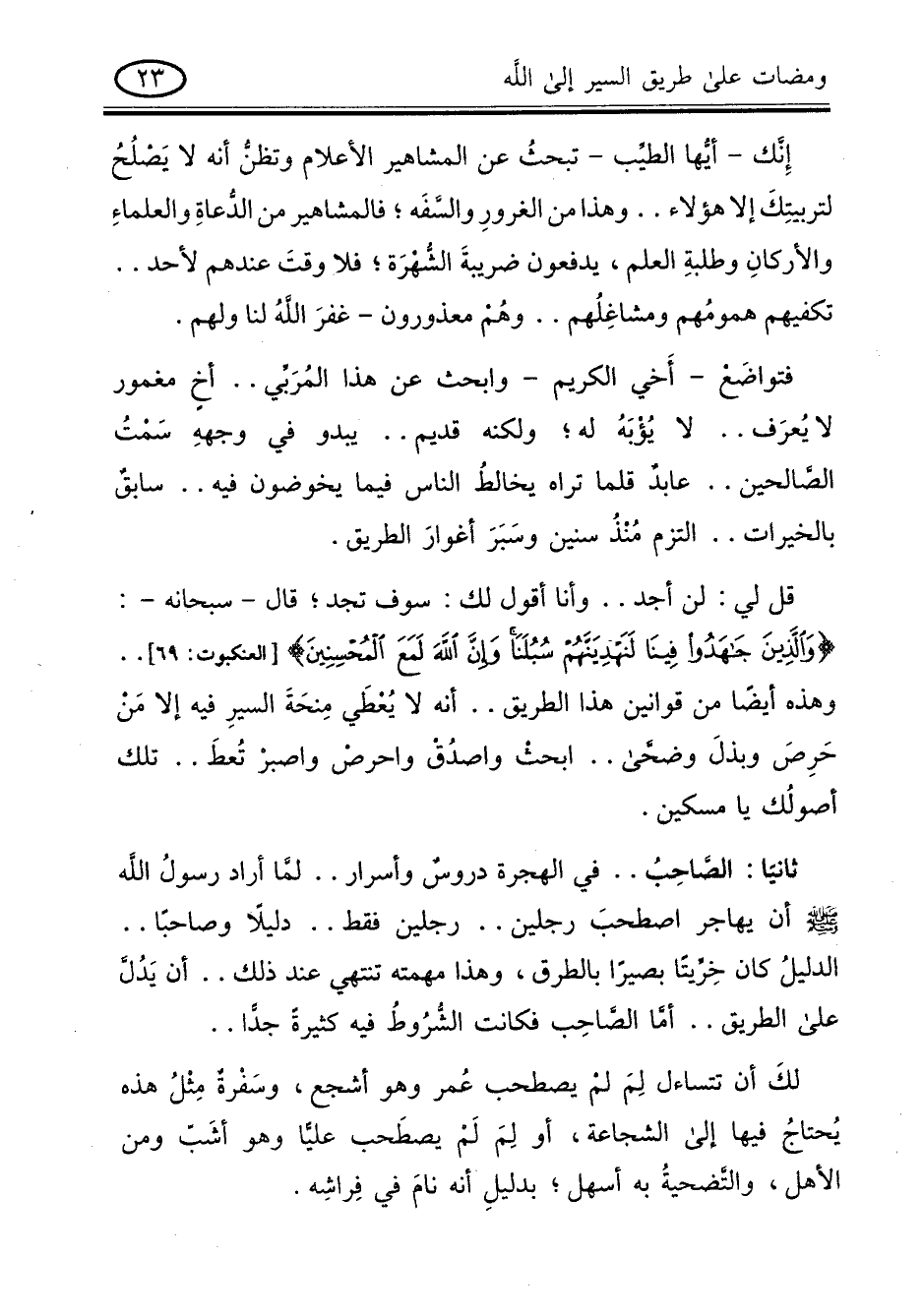 فتواضع- أخى الكريم - وابحث عن هذا المربى .. أخ مغمور لا يعرف .. لا يؤبه له ولكنه قديم يبدو في وجهه سمت الصالحين .. عابد قلما تراه يخالط الناس فيما يخوضون فيه .. سابق بالخيرات .. التزم منذ سنين وسبر أغوار الطريق.