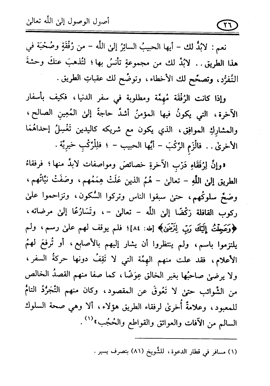 " وان لرفقاء درب الاخرة خصائص ومواصفات لابد منها، فرفقاء الطريق إلى الله تعالى هم الذين علت هممهم وصفت نياتهم وصح سلوكهم حتى سبقوا الناس وتركوا السكون , وتزاحموا على ركوب القافلة ركضا إلى الله تعالى وتسارعا إلى مرضاته " وَعَجِلْتُ إِلَيْكَ رَبِّ لِتَرْضَى" (طه:84) , فلم يوقف لهم على رسم , ولم يلتزموا باسم ولم ينتظروا أن يشار اليهم بالاصابع أو ترفع لهم الاعلام فقد علت منهم الهمة التي لا تقف دونها حركة السفر , ولا يرضى صاحبها بغير الخالق عوضا , كما صفا منهم القصد الخالص من الشوائب حتى لا تعوق عن المقصود , وكان منهم التجرد التام للمعبود , وعلامة أخرى لرفقاء الطريق هؤلاء الا وهى صحة السلوك السالم من الافات والعوائق والقواطع والحجب ".