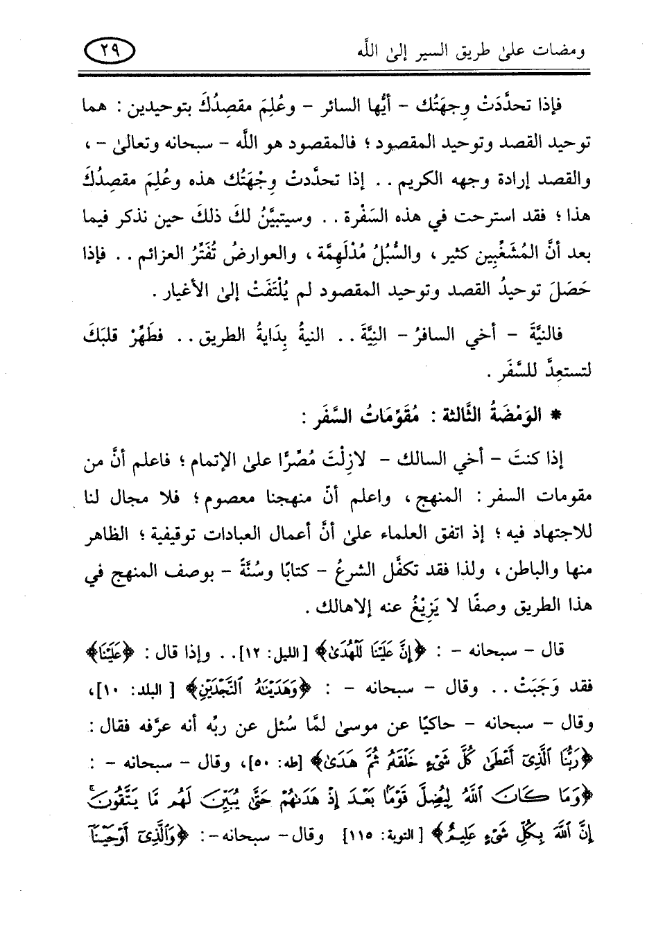 فاذا تحددت وجهتك - أيها السائر - وعلم مقصدك بتوحيدين هما: توحيد القصد وتوحيد المقصود , فالمقصود هو الله سبحانه وتعالى , والقصد ارادة وجهه الكريم .. اذا تحددت وجهتك هذه وعلم مقصدك هذا فقد استرحت في هذه السفرة .. وسيتبين لك ذلك حين نذكر فيما بعد أن المشغبين كثير , والسبل مدلهمة , والعوارض تفتر العزائم .. فاذا حصل توحيد القصد وتوحيد المقصود لم يلتفت إلى الاغيار.
