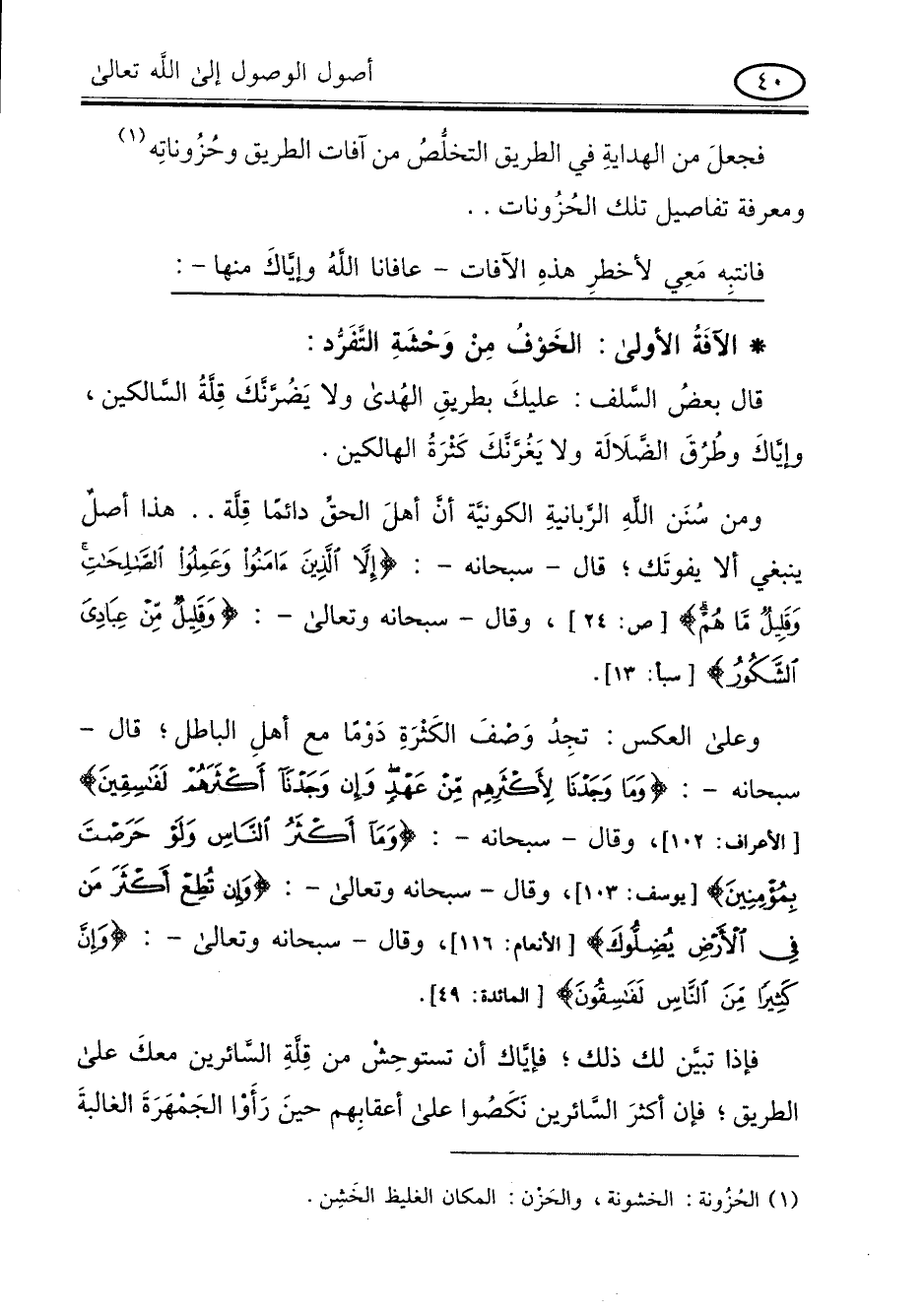 وعلى العكس: تجد وصف الكثرة دوما مع اهل الباطل , قال الله تعالى "وَمَا وَجَدْنَا لِأَكْثَرِهِمْ مِنْ عَهْدٍ وَإِنْ وَجَدْنَا أَكْثَرَهُمْ لَفَاسِقِينَ " (الاعراف: 102) , وقال سبحانه " وَمَا أَكْثَرُ النَّاسِ وَلَوْ حَرَصْتَ بِمُؤْمِنِينَ " (يوسف: 103) وقال سبحانه وتعالى " وَإِنْ تُطِعْ أَكْثَرَ مَنْ فِي الْأَرْضِ يُضِلُّوكَ " (الانعام: 116) وقال سبحانه وتعالى " وَإِنَّ كَثِيرًا مِنَ النَّاسِ لَفَاسِقُونَ " (المائدة: 49). فاذا تبين لك ذلك فاياك ان تستوحش من قلة السائرين معك على الطريق , فان أكثر السائرين نكصوا على اعقابهم حسن رأوا الجمهرة الغالبة