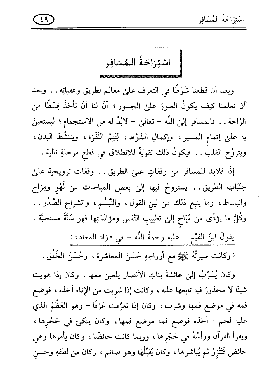وبعد أن قطعنا شوطا في التعرف على معالم الطريق وعقباته .. وبعد أن تعلمنا كيف يكون العبور على الجسور , آن لنا أن نأخذ قسطا من الراحة .. فالمسافر إلى الله تعالى لابد له من الاستجمام ليستعين به على اتمام المسير , وإكمال الشوط لتتمالنفرة ويتنشط البدن ويتروح القلب .. فيكون ذلك تقوية للانطلاق في قطع مرحلة تالية.