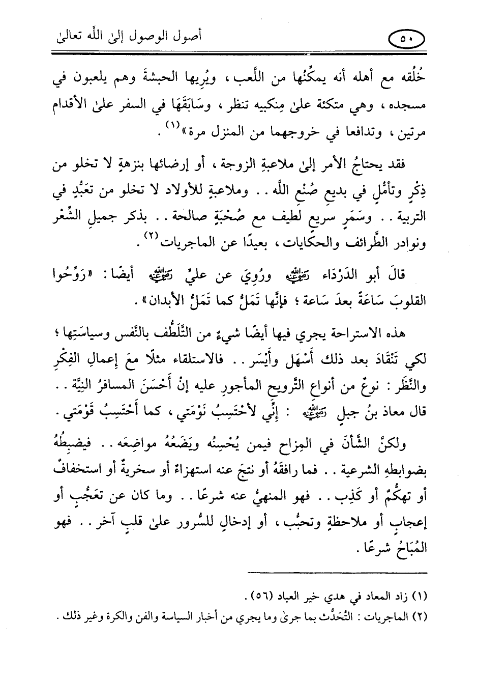 فقد يحتاج الامر إلى ملاعبة الزوجة , أو ارضائها بنزهة لا تخلو من ذكر وتأمل في بديع صنع الله وملاعبة للأولاد لا تخلو من تعبد في التربية .. وسمر سريع لطيف مع صحبة صالحة .. بذكر جميل الشعر ونوادر الطرائف والحكايات , بعيدا عن الماجريات.