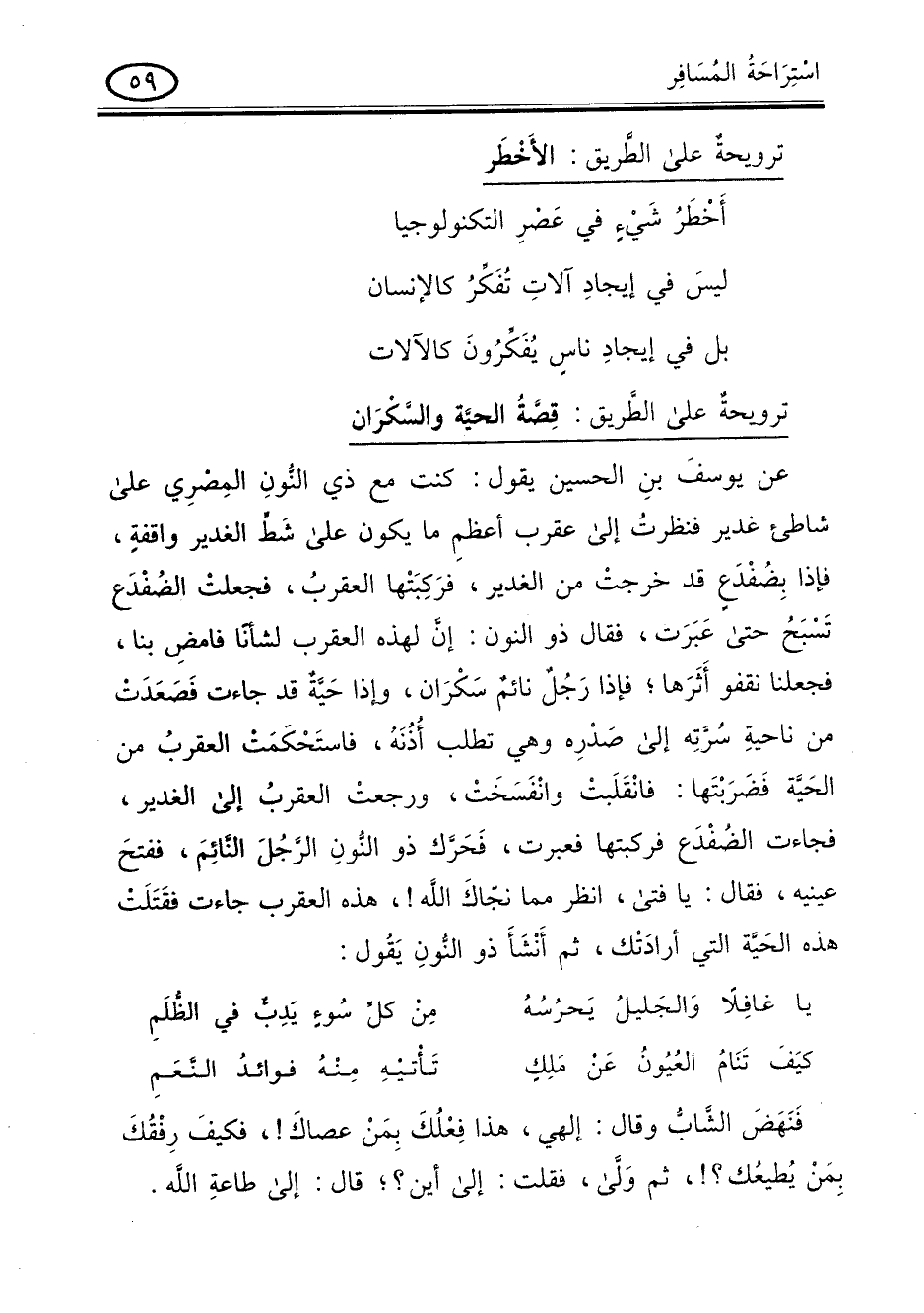 عن يوسف بن الحسين يقول: كنت مع ذي النون المصرى على شاطىء غدير فنظرت إلى عقرب أعظم ما يكون على شط الغدير واقفة فاذا بضفدع قد خرجت من الغدير فركبتها العقرب فجعلت الضفدع تسبح حتى عبرت فقال ذو النون: ان لهذه العقرب لشأنا فامض بنا , فجعلنا نقفو أثرها فاذا رجل نائم سكران وإذا حية قد جاءت فصعدت من ناحية سرته إلى صدره وهى تطلب أذنه فاستحكمت العقرب من الحية فضربتها فانقلبت وانفسخت ورجعت العقرب إلى الغدير فجاءت الضفدع فركبتها فعبرت فحرك ذو النون الرجل النائم , ففتح عينيه فقال: يا فتى انظر مما نجاك الله! هذه العقرب جاءت فقتلت هذه الحية التي أرادتك , ثم أنشأ ذو النون يقول: