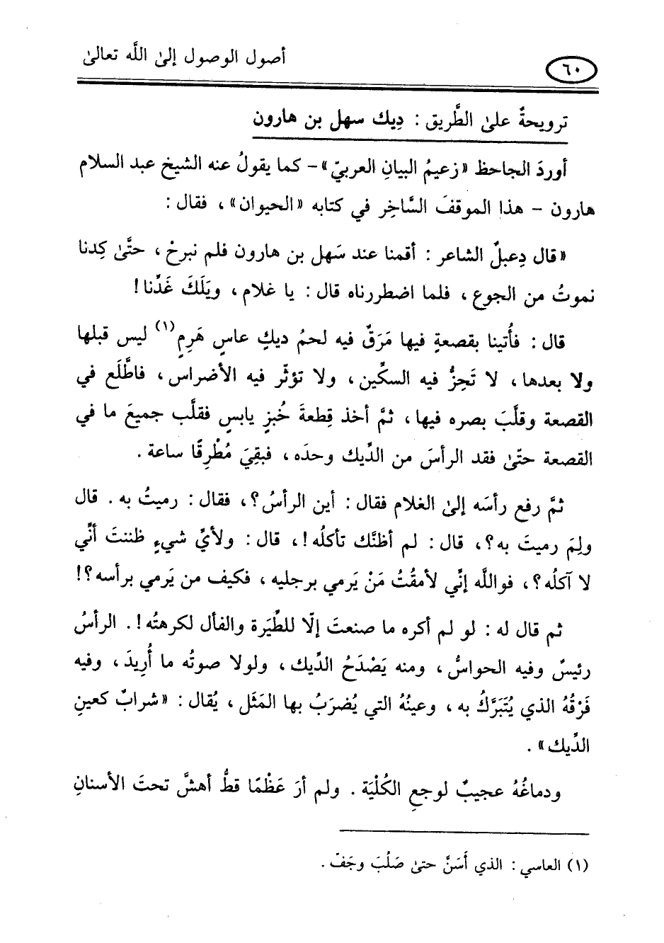 " قال دعبل الشاعر: أقمنا عند سهل بن هارون فلم نبرح حتى كدنا نموت من الجوع , فلما اضطررناه قال: يا غلام , ويلك غدنا! قال: فأتينا بقصعة فيها مرق فيه لحم ديك عاس هرم ليس قبلها ولا بعدها لا تحز فيه السكين , ولا تؤثر فيه الاضراس , فاطلع في القصعة وقلب بصره فيها ثم أخذ قطعة خبز يابس فقلب جميع ما في القصعة , حتى فقد الرأس من الديك وحده, فبقى مطرقا ساعة ثم رفع رأسه إلى الغلام فقال: أين الرأس؟ فقال رميت به , قال ولم رميت به؟ قال: لم أظنك تأكله! قال: ولأى شىء ظننت أنى لا آكله؟ فوالله انى لأمقت من يرمى برجليه فكيف من يرمى برأسه؟! ثم قال: لو لم أكره ما صنعت الا للطّيرة والفأل لكرهته! .. الرأس رئيس وفيه الحواس , ومنه يصدح الديك , ولولا صوته ما أريد , وفيه فرقه الذي يتبرك به , وعينه التي يضرب بها المثل , يقال: " شراب كعين الديك " ودماغه عجيب لوجع الكلية ولم أر عظما قط أهش تحت الأسنان