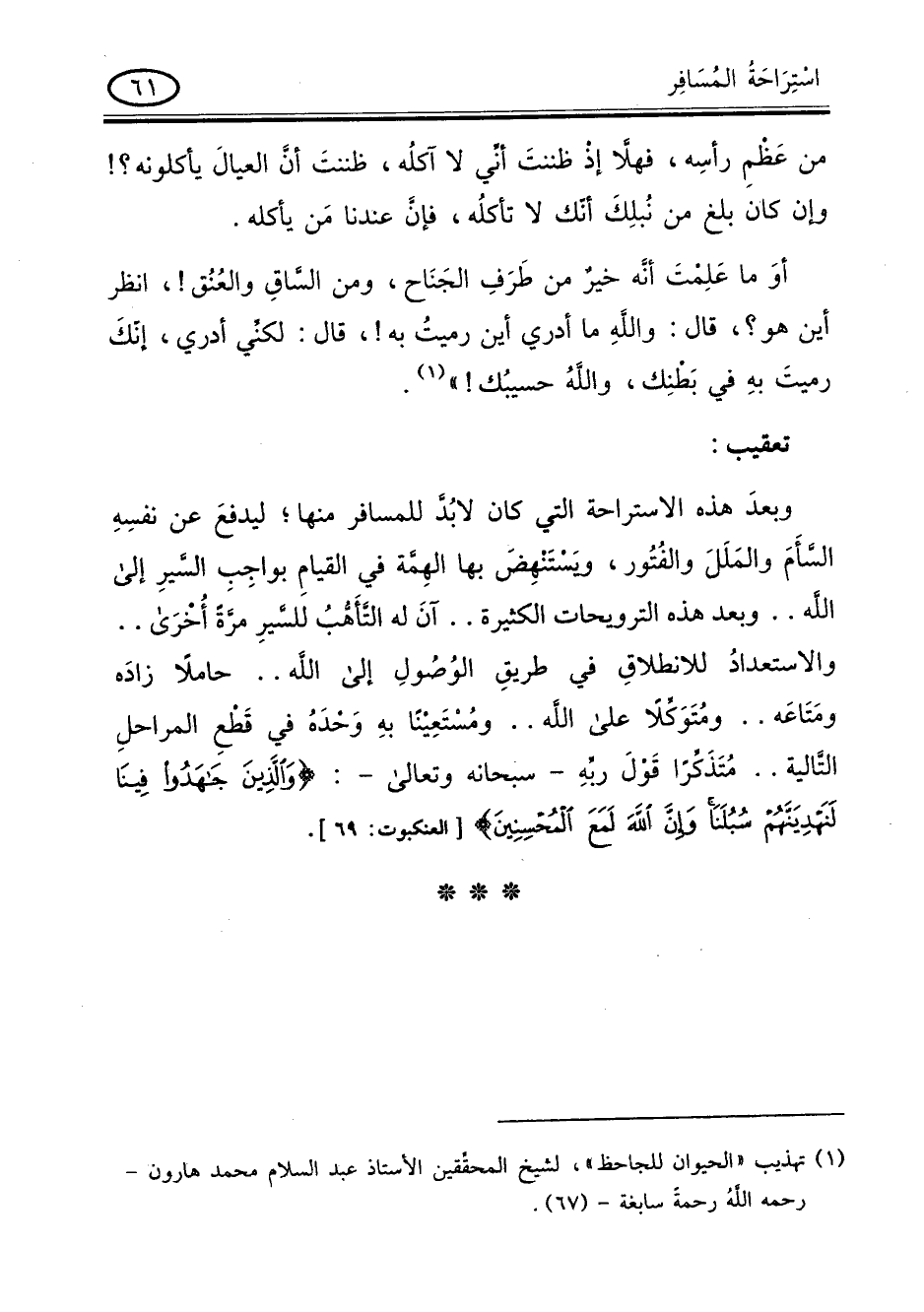 وبعد هذه الاستراحة التي كان لابد للمسافر منها ليدفع عن نفسه السأم والملل والفتور , ويستنهض بها الهمة في القيام بواجب السير إلى الله .. وبعد هذه الترويحات الكثيرة .. آن له التأهب للسير مرة أخرى والاستعداد للانطلاق في طريق الوصول إلى الله حاملا زاده ومتاعه ومتوكلا على الله ومستعينا به وحده في قطع المراحل التالية متذكرا قول ربه - سبحانه وتعالى - " والذين جاهدوا فينا لنهدينهم سبلنا وان الله لمع المحسنين " (العنكبوت: 69).