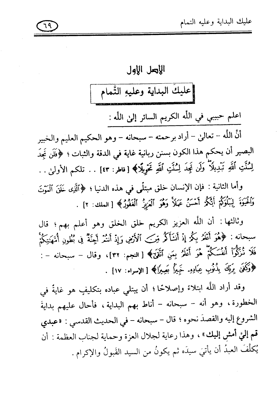 وقد أراد الله ابتلاء واصلاحا , أن يبتلى عباده بتكليف هو غاية في الخطورة وهو أنه - سبحانه - أناط بهم البداية , فأحال عليهم بداية الشروع إليه والقصد نحوه , قال - سبحانه - في الحديث القدسى: " عبدى قم إلى أمش إليك " , وهذا رعاية لجلال العزة وحماية لجناب العظمة: أن يكلف العبد أن يأتى سيده ثم يكون من السيد القبول والاكرام.