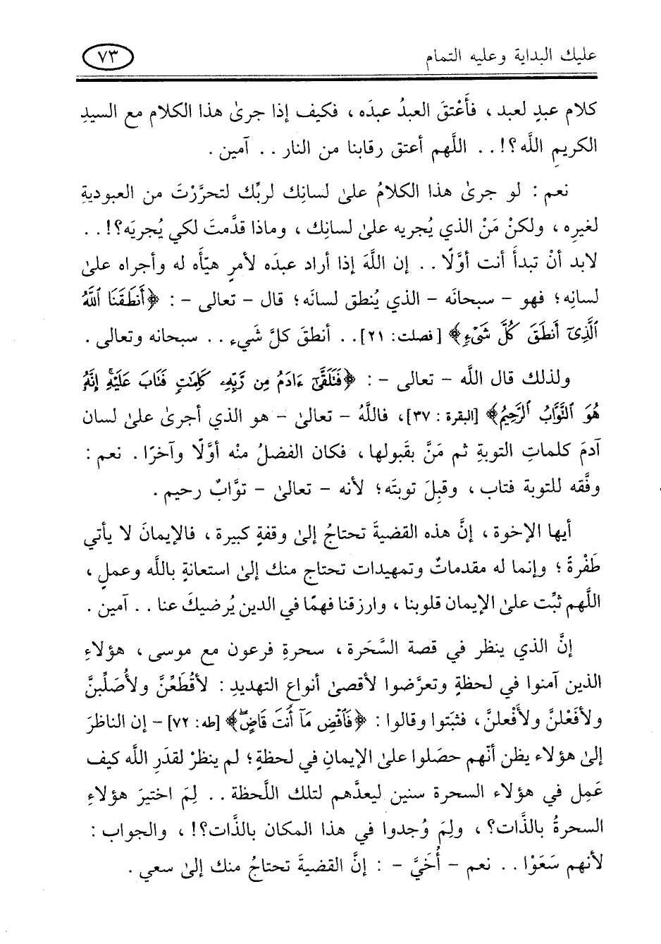 نعم: لو جرى هذا الكلام على لسانك لربك لتحررت من العبودية لغيره , ولكن من الذي يجريه على لسانك , وماذا قدمت لكى يجريه؟! لابد أن تبدأ أنت أولا .. ان الله اذا أراد عبده لأمر هيأه له وأجراه على لسانه فهو - سبحانه - الذي ينطق لسانه , قال - تعالى - " أنطقنا الله الذي أنطق كل شىء " (فصلت: 21) .. أنطق كل شىء .. سبحانه وتعالى.