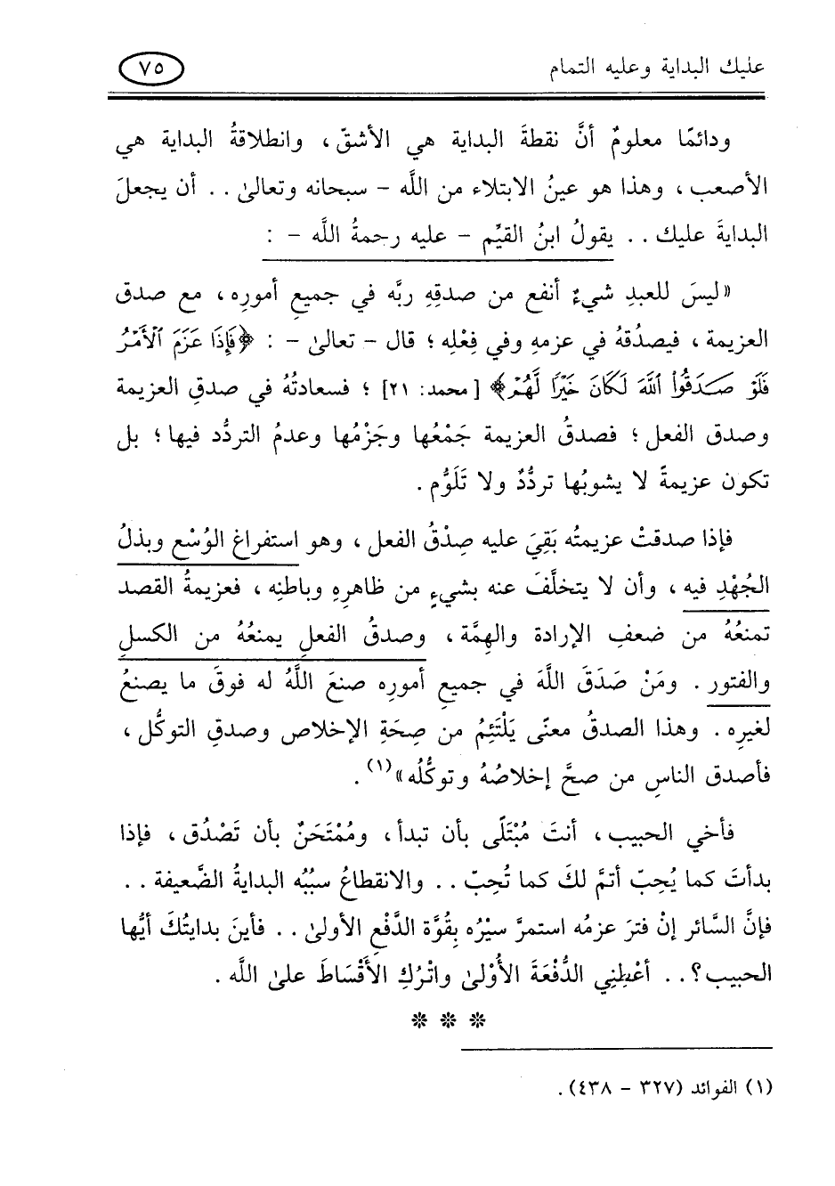 ودائما معلوم أن نقطة البداية هى الاشق , وانطلاقة البداية هى الأصعب , وهذا هو عين الابتلاء من الله - سبحانه وتعالى - " فاذا عزم الامر فلو صدقوا الله لكان خيرا لهم " (محمد: 21) فسعادته في صدق العزيمة وصدق الفعل فصدق العزيمة جمعها وجزمها وعدم التردد فيها بل تكون عزيمة لا يشوبها تردد ولا تلوّم.
