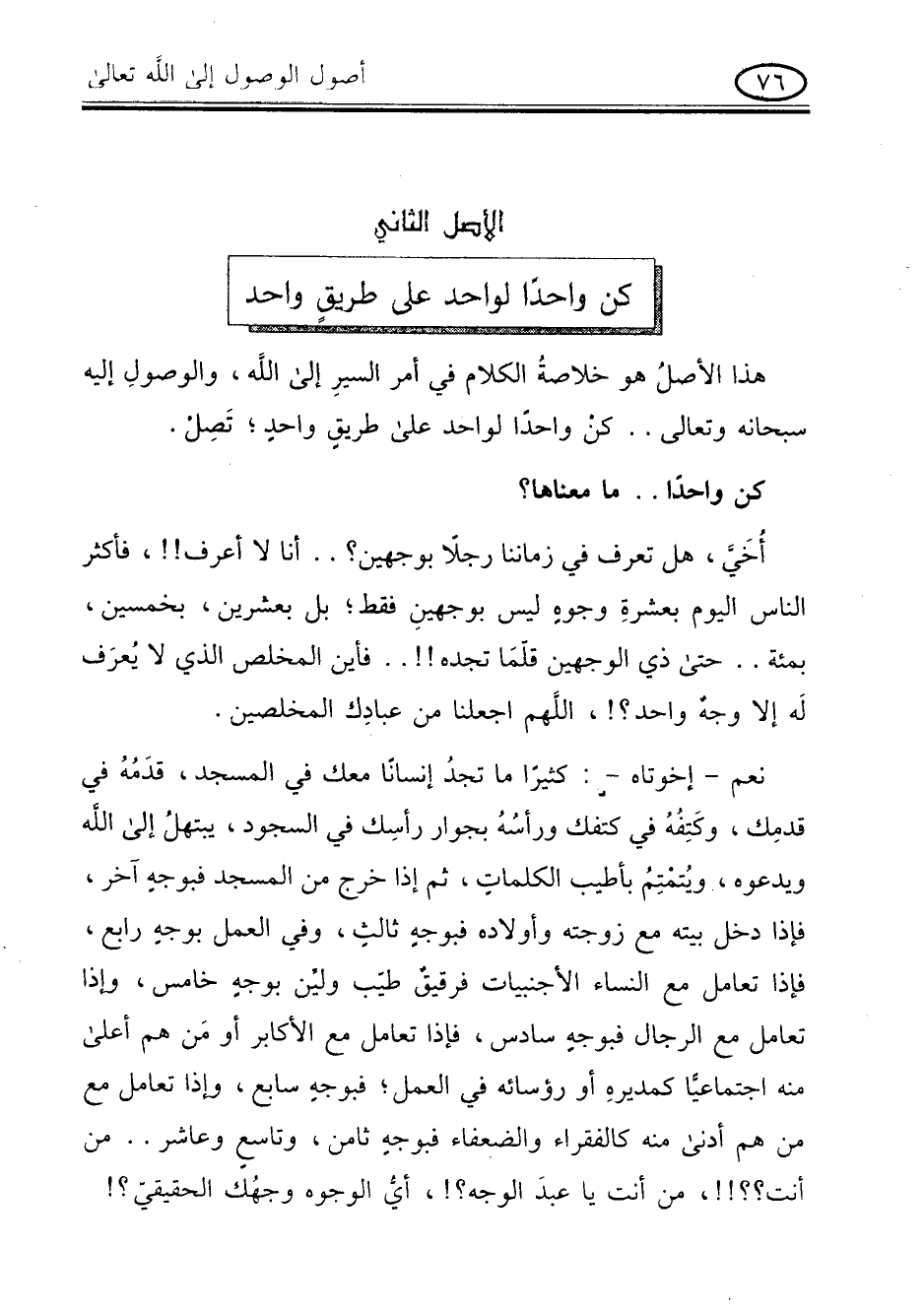 هذا الأصل هو خلاصة الكلام في أمر السير إلى الله , والوصول إليه سبحانه وتعالى .. كن واحدا لواحد على طريق واحد تصل.