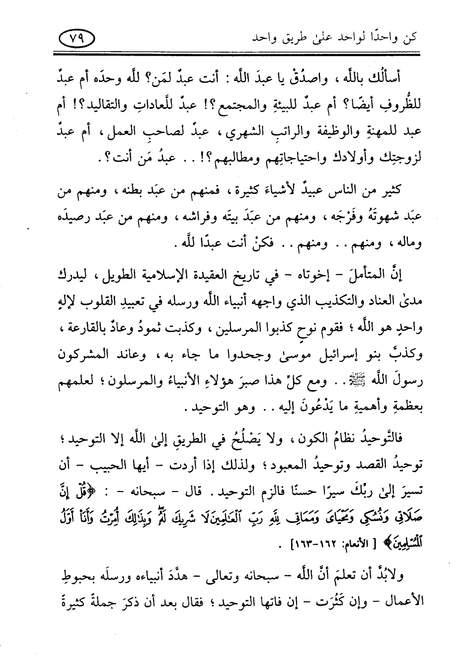فالتوحيد نظام الكون , ولا يصلح في الطريق إلى الله الا التوحيد , توحيد القصد وتوحيد المعبود ولذلك اذا أردت - أيها الحبيب - أن تسير إلى ربك سيرا حسنا فالزم التوحيد , قال - سبحانه وتعالى - " قل ان صلاتى ونسكى ومحياى ومماتى لله رب العالمين لا شريك له وبذلك أمرت وأنا أول المسلمين " (الانعام: 162 - 163).