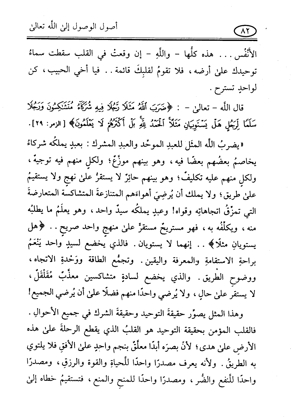 " يضرب الله المثل للعبد الموحد والعبد المشرك: بعبد يملكه شركاء يخاصم بعضهم بعضا فيه " وهو بينهم موزع , ولكل منهم فيه توجيه , ولكل منهم عليه تكليف , وهو بينهم حائر لا يستقر على نهج ولا يستقيم على طريق , ولا يملك أن يرضى أهوائهم المتنازعة المتشاكسة المتعارضة التي تمزق اتجاهاته وقواه! وعبد يملكه سيد واحد , وهو يعلم ما يطلبه منه , ويكلفه به , فهو مستريح مستقر على منهج واحد صريح .. " هل يستويان مثلا " .. انهما لا يستويان.