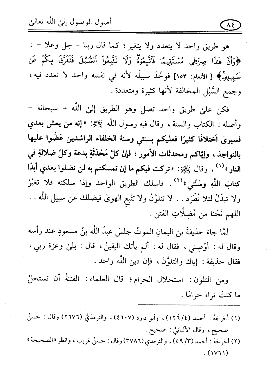 فكن على طريق واحد تصل وهو الطريق إلى الله - سبحانه وتعالى - وأصله: الكتاب والسنة وقال رسول الله صلى الله عليه وسلم: " انه من يعش بعدى فسيرى اختلافا كثيرا فعليكم بسنتى وسنة الخلفاء الراشدين عضوا عليها بالنواجذ , واياكم ومحدثات الأمور , فان كل محدثة بدعة وكل ضلالة في النار " [صححه الألباني] وقال صلى الله عليه وسلم: " تركت فيكم ما ان تمسكتم به لن تضلوا بعدى أبدا كتاب الله وسنتى " [أحمد والترمذى وقال حسن غريب] فاسلك الطريق الواحد وإذا سلكته فلا تغير ولا تبدل لئلا تطرد .. لا تتلون ولا تتبع الهوى فيضلك عن سبيل الله .. اللهم نجنا من مضلات الفتن.
