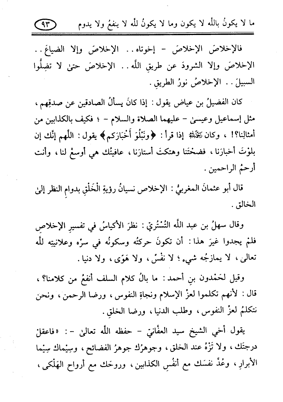 وقيل لحمدون بن أحمد: ما بال كلام السلف أنفع من كلامنا؟ قال: لأنهم تكلموا لعز الإسلام ونجاة النفوس ورضا الرحمن , ونحن نتكلم لعز النفوس وطلب الدنيا ورضا الخلق.