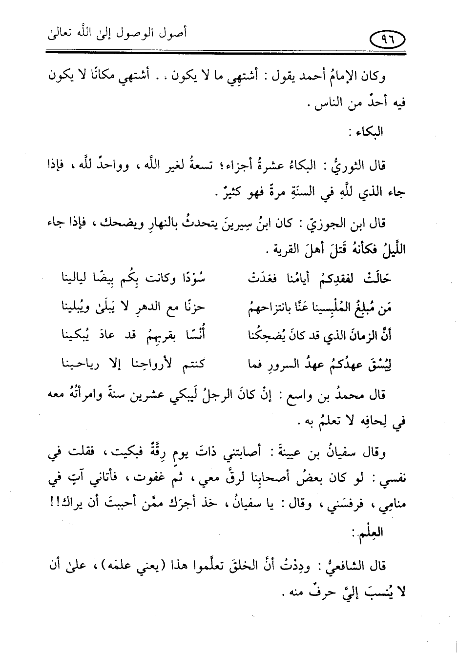 وقال سفيان بن عيينة: أصابتنى ذات يوم رقة فبكيت فقلت في نفسى: لو كان بعض أصحابنا لرق معى ثم غفوت فأتانى أت في منامى فرفسنى وقال: يا سفيان خذ أجرك ممن أحببت أن يراك!!