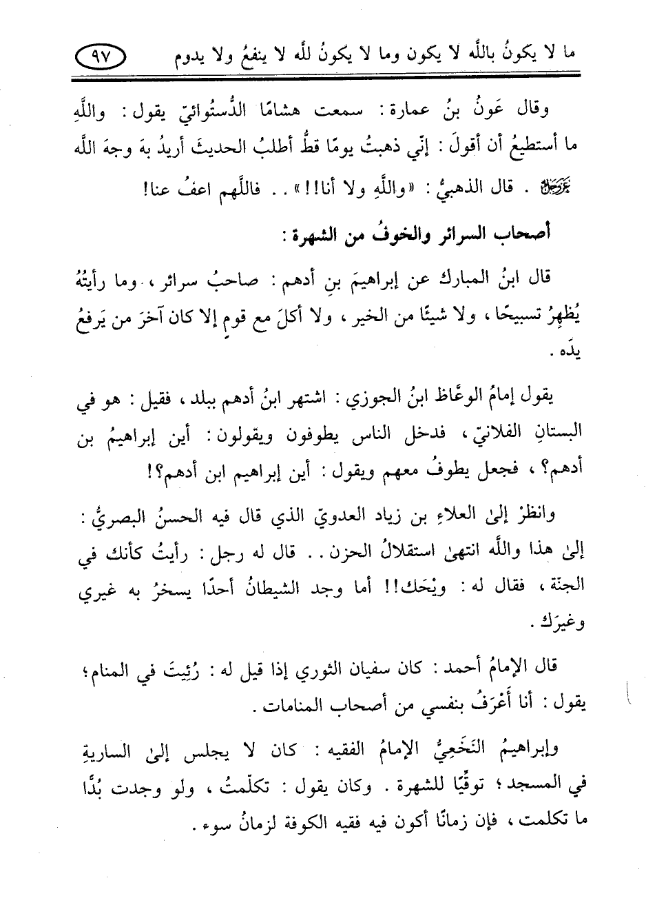 وقال عون بن عمارة: سمعت هشام الدستوائى يقول: والله ما أستطيع أن أقول: إنى ذهب يوما قط أطلب الحديث اريد به وجه الله عز وجل. قال الذهبى: والله ولا أنا .. فاللهم أعف عنا!