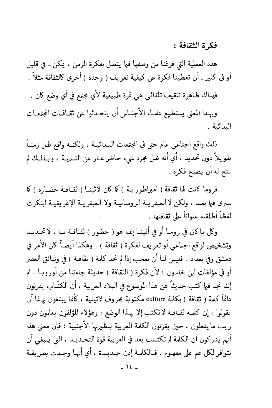 وكل ما كان في روما أو في أثينا إنما هو (حضور) ثقافة ما، لا تحديد وتشخيص لواقع اجتماعي أو تعريف لفكرة (ثقافة). وهكذا أيضاً كان الأمر في دمشق وفي بغداد. فليس لنا أن نعجب إذا لم نجد كلمة (ثقافة) في وثائق العصر أو في مؤلفات ابن خلدون؛ لأن فكرة (الثقافة) حديثة جاءتنا من أوروبا. ثم إننا نجد فيها كتب حديثاً عن هذا الموضوع في البلاد العربية، أن الكتّاب يقرنون دائماً كلمة (ثقافة) بكلمة culture مكتوبة بحروف لاتينية، كأنما يبتغون بهذا أن يقولوا: إن كلمة ثقافة لا تكتب إلا بهذا الوضع؛ وهؤلاء المؤلفون يعلمون دون ريب ما يفعلون، حين يقرنون الكلمة العربية بنظيرتها الأجنبية؛ فإن معنى هذا أنهم يدركون أن الكلمة لم تكتسب بعد في العربية قوة التحديد، التي ينبغي أن تتوافر لكل علم على مفهوم. فالكلمة إذن جديدة، أي أنها وجدت بطريقة