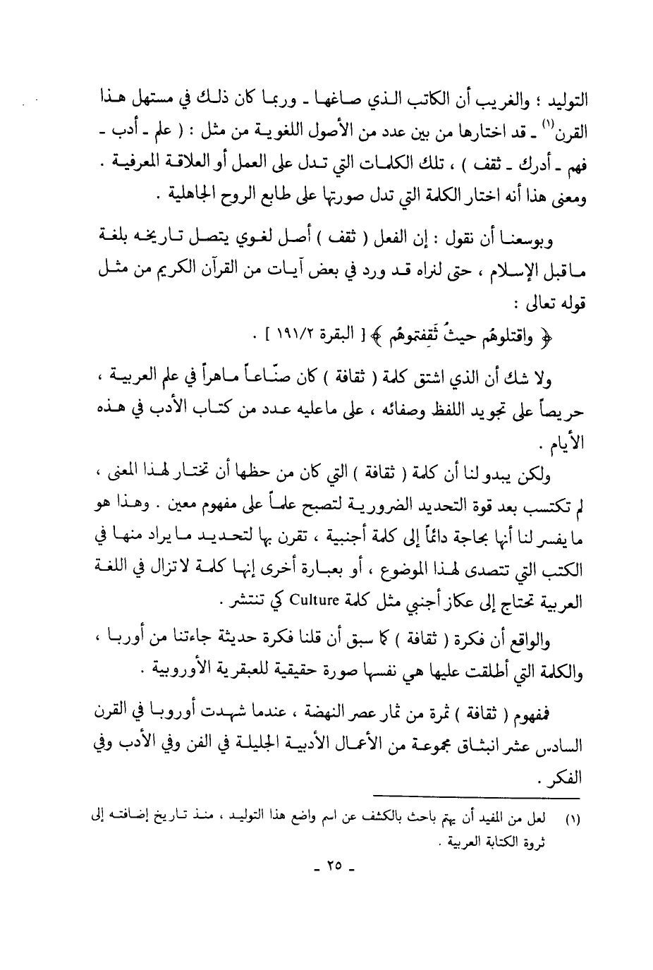 ولا شك أن الذي اشتق كلمة (ثقافة) كان صنّاعاً ماهراً في علم العربية، حريصاً على تجويد اللفظ وصفائه، على ما عليه عدد من كتاب الأدب في هذه الأيام.