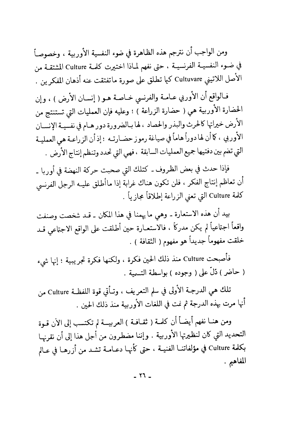 ومن هنا نفهم أيضاً أن كلمة (ثقافة) العربية لم تكتسب إلى الآن قوة التحديد التي كان لنظيرتها الأوربية. وإننا مضطرون من أجل هذا إلى أن نقرنها بكلمة Culture في مؤلفاتنا الفنية، حتى كأنها دعامة تشد من أزرها في عالم المفاهيم.