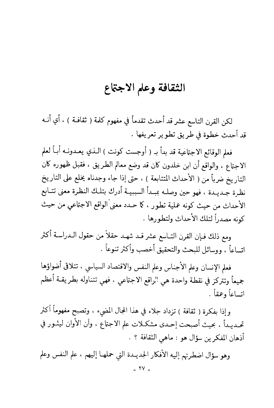 وإذا بفكرة (ثقافة) تزداد جلاء في هذا المجال المضيء، وتصبح مفهوماً أكثر تحديداً، بحيث أصبحت إحدى مشكلات علم الاجتماع، وآن الأوان ليثور في أذهان المفكرين سؤال هو: ما هي الثقافة؟.