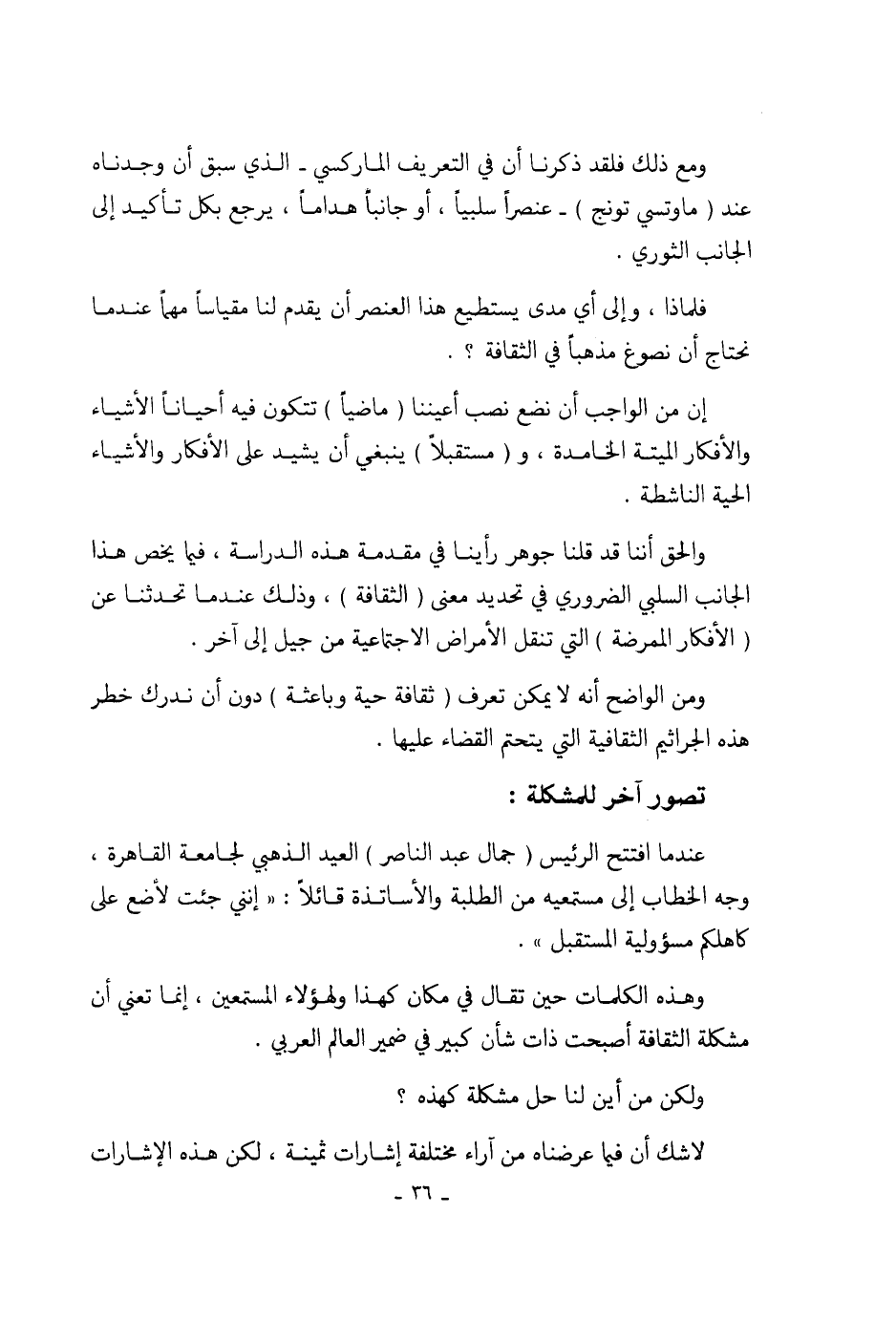 ومن الواضح أنه لا يمكن تعرف (ثقافة حية وباعثة) دون أن ندرك خطر هذه الجراثيم الثقافية التي يتحتم القضاء عليها.