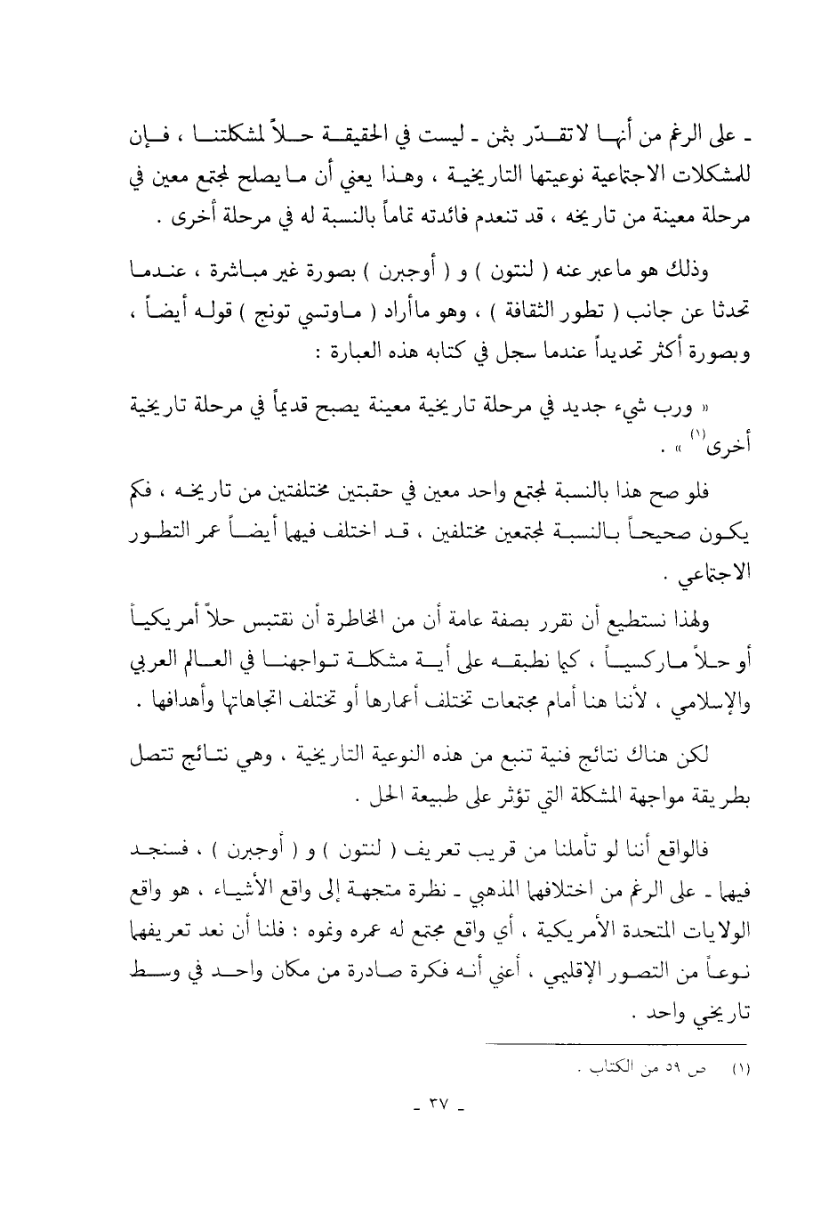 ولهذا نستطيع أن نقرر بصفة عامة أن من الخاطرة أن نقتبس حلاً أمريكياً أو حلاً ماركسياً، كما نطبقه على أية مشكلة تواجهنا في العالم العربي والإسلامي، لأننا هنا أمام مجتمعات تختلف أعمارها أو تختلف اتجاهاتها وأهدافها.