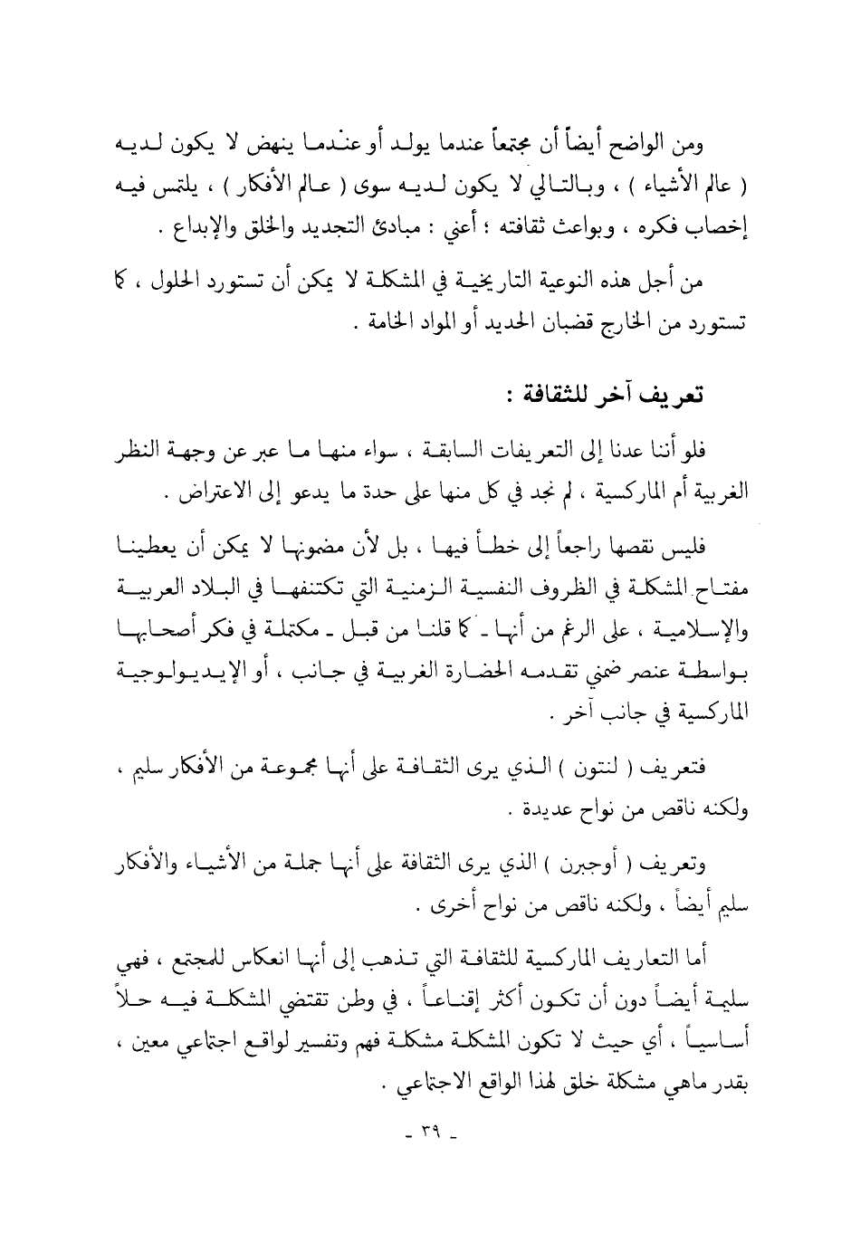 أما التعاريف الماركسية للثقافة التي تذهب إلى أنها انعكاس للمجتمع، فهي سليمة أيضاً دون أن تكون أكثر إقناعاً، في وطن تقتضي المشكلة فيه حلاً أساسياً، أي حيث لا تكون المشكلة مشكلة فهم وتفسير لواقع اجتماعي معين، بقدر ما هي مشكلة خلق لهذا الواقع الاجتماعي.