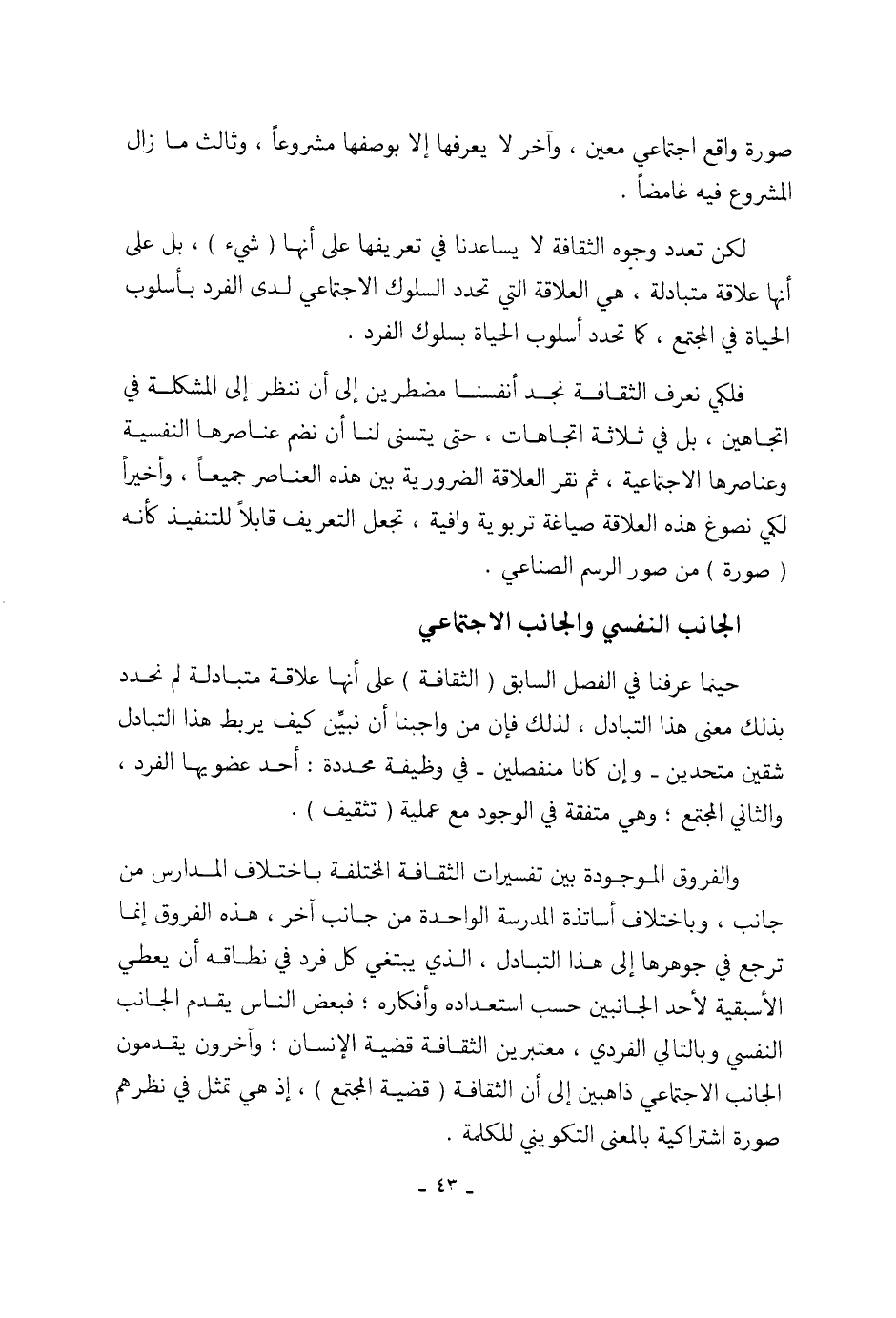 فلكي نعرف الثقافة نجد أنفسنا مضطرين إلى أن ننظهر إلى المشكلة في اتجاهين، بل في ثلاثة اتجاهات، حتى يتسنى لنا أن نفهم عناصرها النفسية وعناصرها الاجتماعية، ثم نقر العلاقة الضرورية بين هذه العناصر جميعاً، وأخيراً لكي نصوغ هذه العلاقة صياغة تربوية وافية، تجعل التعريف قابلاً للتنفيذ كأنه (صورة) من صور الرسم الصناعي.