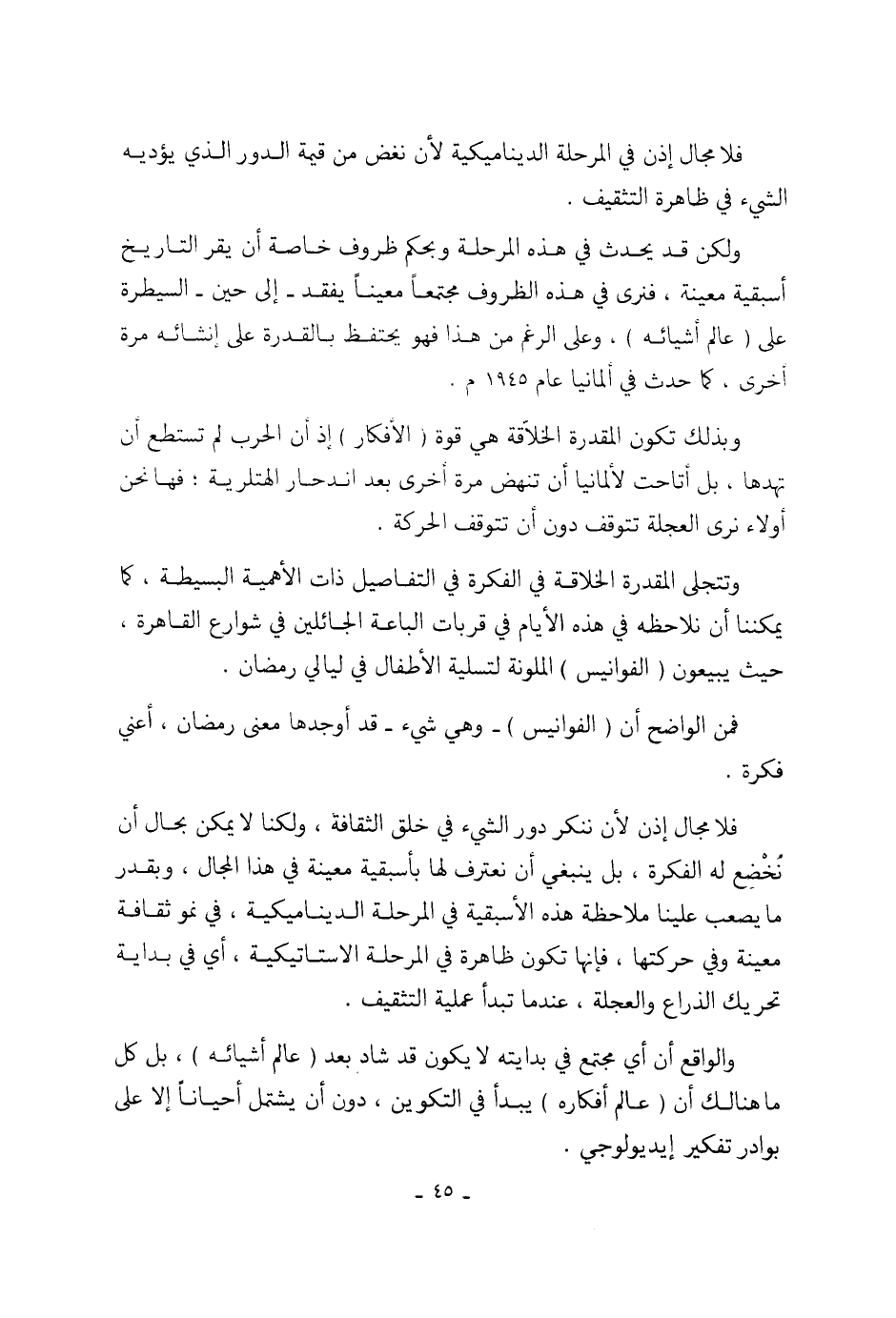 فلا مجال إذن لأن ننكر دور الشيء في خلق الثقافة، ولكنا لا يمكن بحال أن نُخْضِع له الفكرة، بل ينبغي أن نعترف لها بأسبقية معينة في هذا المجال، وبقدر ما يصعب علينا ملاحظة هذه الأسبقية في المرحلة الديناميكية، في نمو ثقافة معينة وفي حركتها، فإنها تكون ظاهرة في المرحلة الاستاتيكية، أي في بداية تحريك الذراع والعجلة، عندما تبدأ عملية التثقيف.