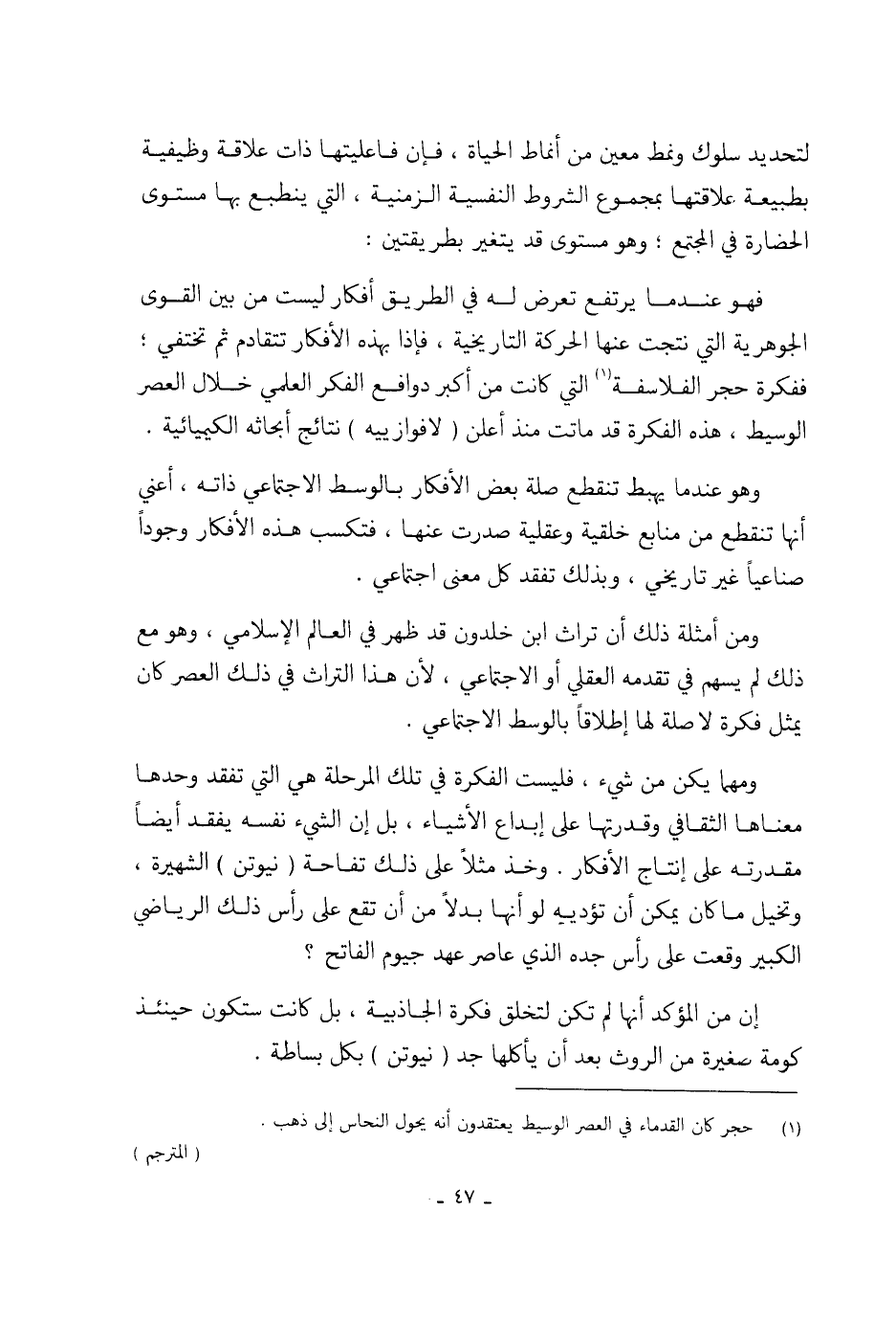 فهو عندما يرتفع تعرض له في الطريق أفكار ليست من بين القوى الجوهرية التي نتجت عنها الحركة التاريخية، فإذا بهذه الأفكار تتقادم ثم تختفي؛ ففكرة حجر الفلاسفة (¬1) التي كانت من أكبر دوافع الفكر العلمي خلال العصر الوسيط، هذه الفكرة قد ماتت منذ أعلن (لافوازييه) نتائج أبحاثه الكيميائية.