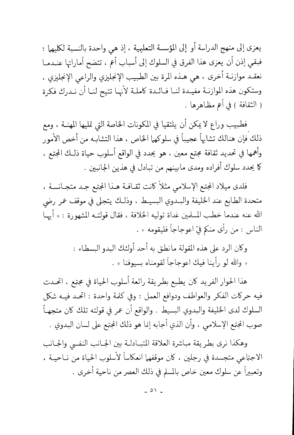 يعزى إلى منهج الدراسة أو إلى المؤسسة التعليمية، إذ هي واحدة بالنسبة لكليهما؛ فبقي إذن أن يعزى هذا الفرق في السلوك إلى أسباب أعم، تتضح أماراتها عندما نعقد موازنة أخرى، هي هذه المرة بين الطبيب الإنجليزي والراعي الإنجليزي، وستكون هذه الموازنة مفيدة لنا فائدة كاملة لأنها تتيح لنا أن ندرك فكرة (الثقافة) في أعم مظاهرها.