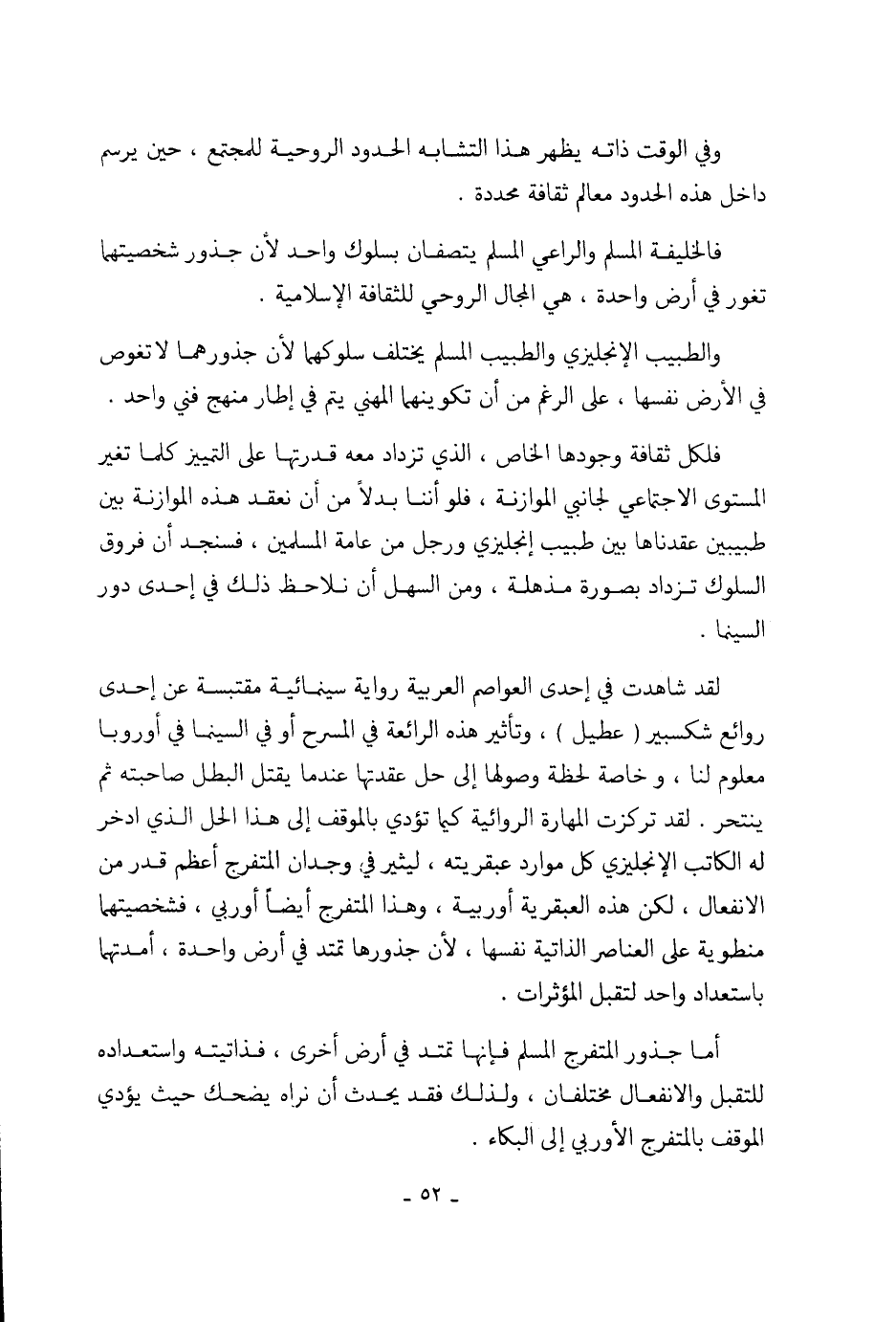 لقد شاهدت في إحدى العواصم العربية رواية سينمائية مقتبسة عن إحدى روائع شكسبير (عطيل)، وتأثير هذه الرائعة في المسرح أو في السينما في أوروبا معلوم لنا، وخاصة لحظة وصولها إلى حل عقدتها عندما يقتل البطل صاحبته ثم ينتحر. لقد تركزت المهارة الروائية كما تؤدي بالموقف إلى هذا الحل الذي ادخر له الكاتب الإنجليزي كل موارد عبقريته، ليثير في وجدان المتفرج أعظم قدر من الانفعال، لكن هذه العبقرية أوربية، وهذا المتفرج أيضاً أوربي، فشخصيتهما منطوية على العناصر الذاتية نفسها، لأن جذورها تمتد في أرض واحدة، أمدتهما باستعداد واحد لتقبل المؤثرات.