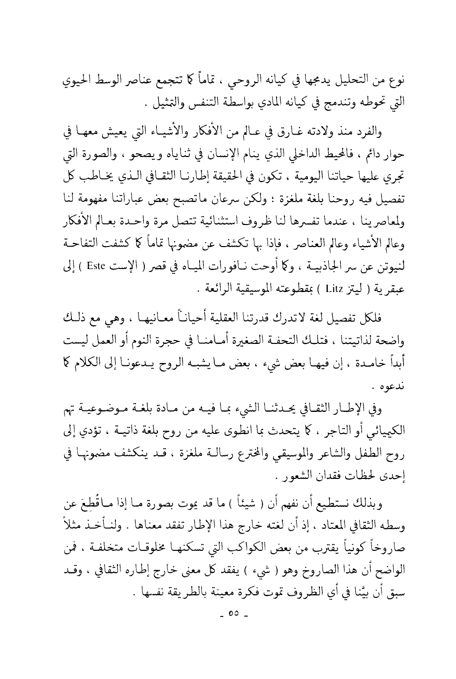 والفرد منذ ولادته غارق في عالم من الأفكار والأشياء التي يعيش معها في حوار دائم، فالمحيط الداخلي الذي ينام الإنسان في ثناياه ويصحو، والصورة التي تجري عليها حياتنا اليومية، تكون في الحقيقة إطارنا الثقافي الذي يخاطب كل تفصيل فيه روحنا بلغة ملغزة؛ ولكن سرعان ما تصبح بعض عباراتنا مفهومة لنا ولمعاصرينا، عندما تفسرها لنا ظروف استثنائية تتصل مرة واحدة بعالم الأفكار وعالم الأشياء وعالم العناصر، فإذا بها تكشف عن مضمونها تماماً كما كشفت التفاحة لنيوتن عن سر الجاذبية، وكما أوحت نافورات المياه في قصر (الإست Este) إلى عبقرية (ليتز Litz) بمقطوعته الموسيقية الرائعة.
