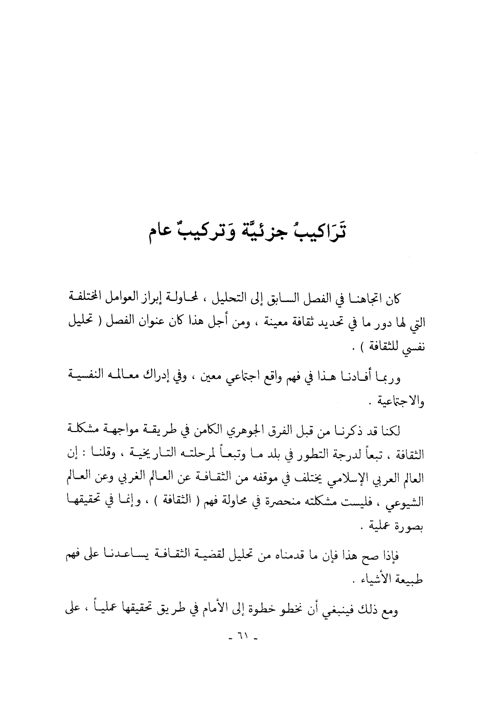 كان اتجاهنا في الفصل السابق إلى التحليل، لمحاولة إبراز العوامل المختلفة التي لها دور ما في تحديد ثقافة معينة، ومن أجل هذا كان عنوان الفصل (تحليل نفسي للثقافة).