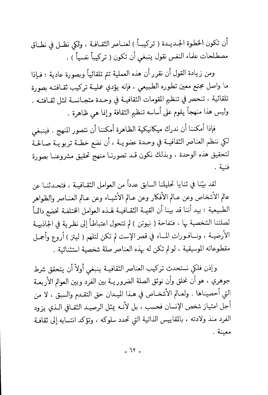 أن تكون الخطوة الجديدة (تركيباً) لعناصر الثقافة، ولكي نظل في نطاق مصطلحات علماء النفس نقول ينبغي أن تكون (تركيباً نفسياً).