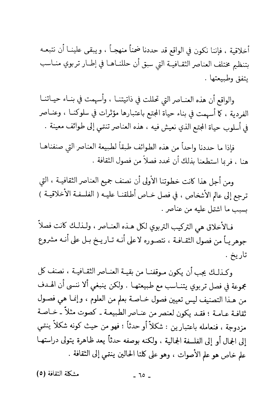 ومن أجل هذا كانت خطوتنا الأولى أنما نصنف جميع العناصر الثقافية، التي ترجع إلى عالم الأشخاص، في فصل خاص أطلقنا عليه (الفلسفة الأخلاقية) بسبب ما اشتمل عليه من عناصر.