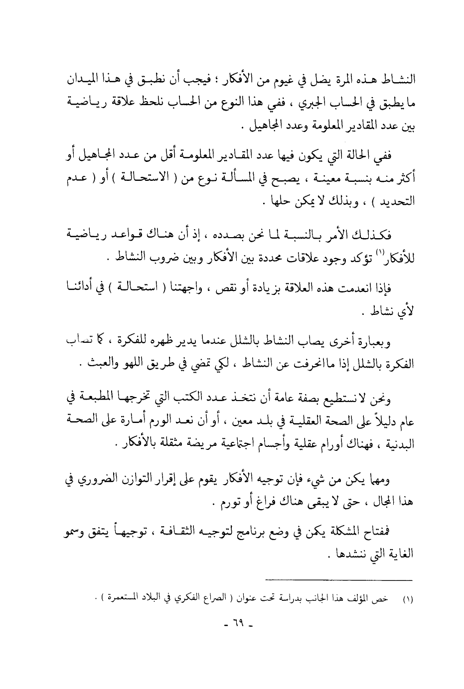 فكذلك الأمر بالنسبة لما نحن بصدده، إذ أن هناك قواعد رياضية للأفكار (¬1) تؤكد وجود علاقات محددة بين الأفكار وبين ضروب النشاط.