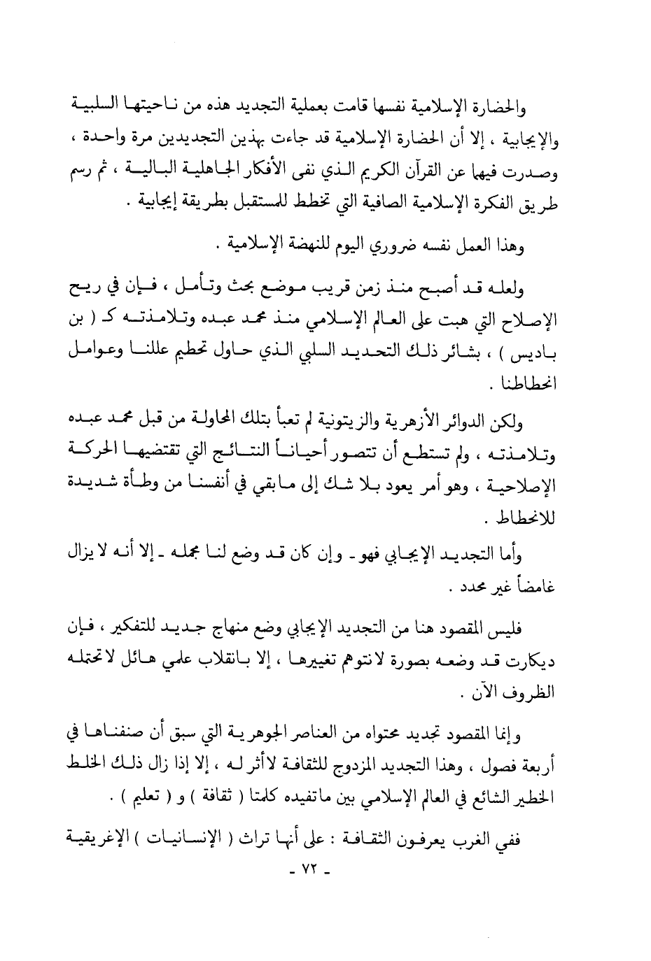 والحضارة الإسلامية نفسها قامت بعملية التجديد هذه من ناحيتها السلبية والإيجابية، إلا أن الحضارة الإسلامية قد جاءت بهذين التجديدين مرة واحدة، وصدرت فيهما عن القرآن الكريم الذي نفى الأفكار الجاهلية البالية، ثم رسم طريق الفكرة الإسلامية الصافية التي تخطط للمستقبل بطريقة إيجابية.