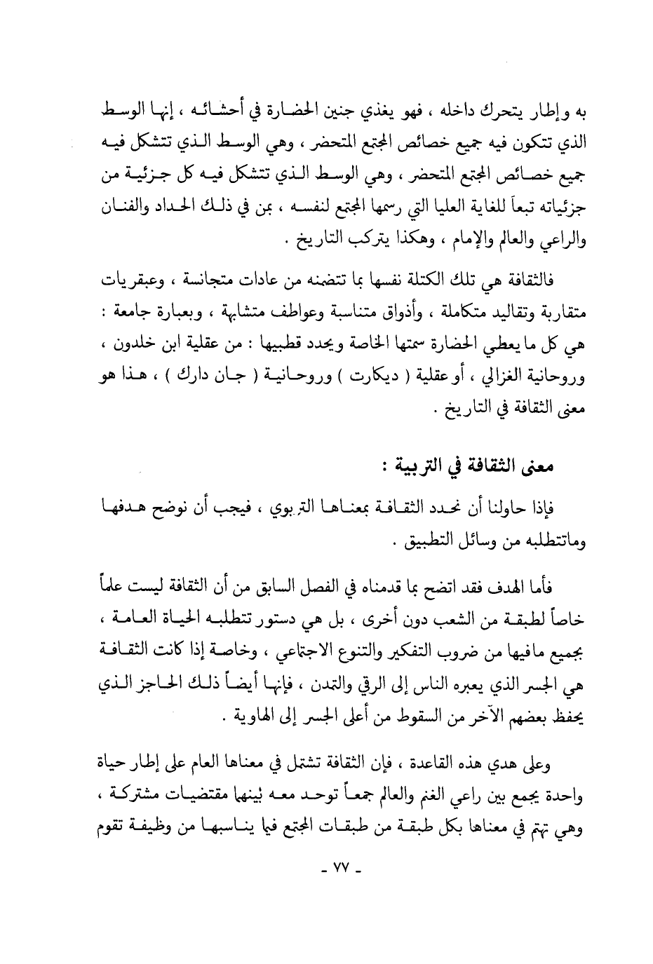 فالثقافة هي تلك الكتلة نفسها بما تتضمنه من عادات متجانسة، وعبقريات متقاربة وتقاليد متكاملة، وأذواق متناسبة وعواطف متشابهة، وبعبارة جامعة: هي كل ما يعطي الحضارة سمتها الخاصة ويحدد قطبيها: من عقلية ابن خلدون، وروحانية الغزالي، أو عقلية (ديكارت) وروحانية (جان دارك)، هذا هو معنى الثقافة في التاريخ.