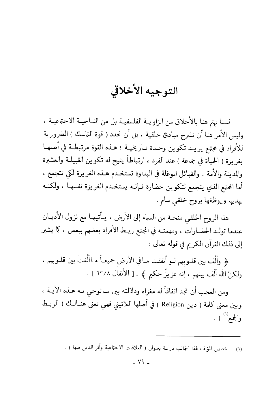 لسنا نهتم هنا بالأخلاق من الزاوية الفلسفية بل من الناحية الاجتماعية، وليس الأمر هنا أن نشرح مبادئ خلقية، بل أن نحدد (قوة التماسك) الضرورية للأفراد في مجتمع يريد تكوين وحدة تاريخية؛ هذه القوة مرتبطة في أصلها بغريزة (الحياة في جماعة) عند الفرد، ارتباطاً يتيح له تكوين القبيلة والعشيرة والمدينة والأمة. والقبائل الموغلة في البداوة تستخدم هذه الغريزة لكي تتجمع، أما المجتمع الذي يتجمع لتكوين حضارة فإنه يستخدم الغريزة نفسها، ولكنه يهديها ويوظفها بروح خلقي سامٍ.