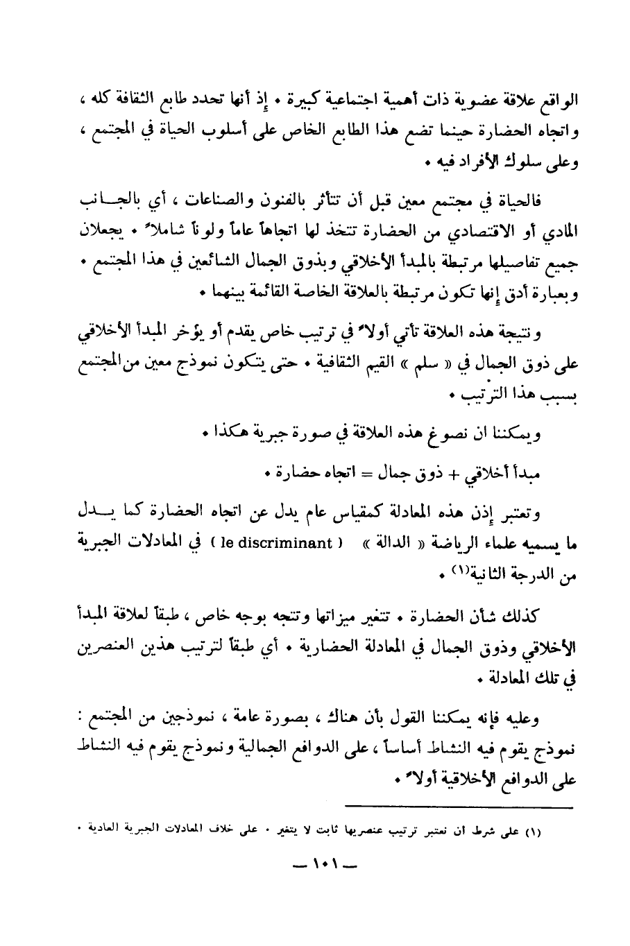 وتعتبر إذن هذه المعادلة كمقياس عام يدل عن اتجاه الحضارة كما يدل ما يسميه علماء الرياضة " الدالة " ( le discriminant) في المعادلات الجبرية من الدرجة الثانية (1).